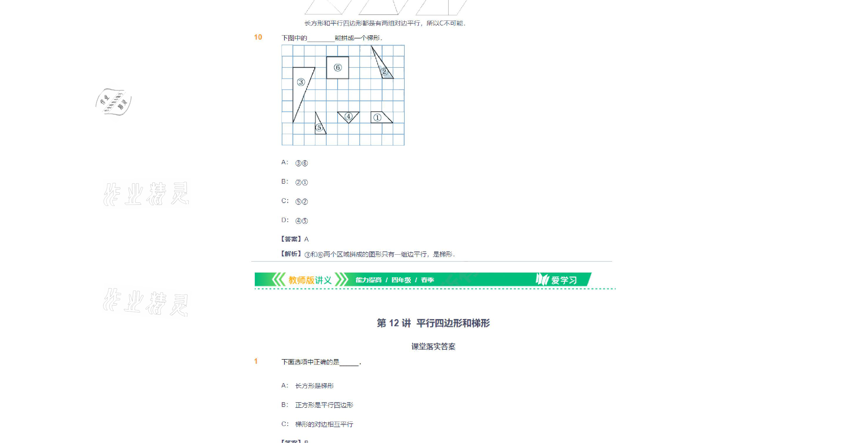 注:目前有些书本章节名称可能整理的还不是很完善,但都是按照顺序排列的,请同学们按照顺序仔细查找。练习册 2021年爱学习数学四年级下册苏教版能力提高体系首都师范大学出版社 答案主要是用来给同学们做完题方便对答案用的,请勿直接抄袭。