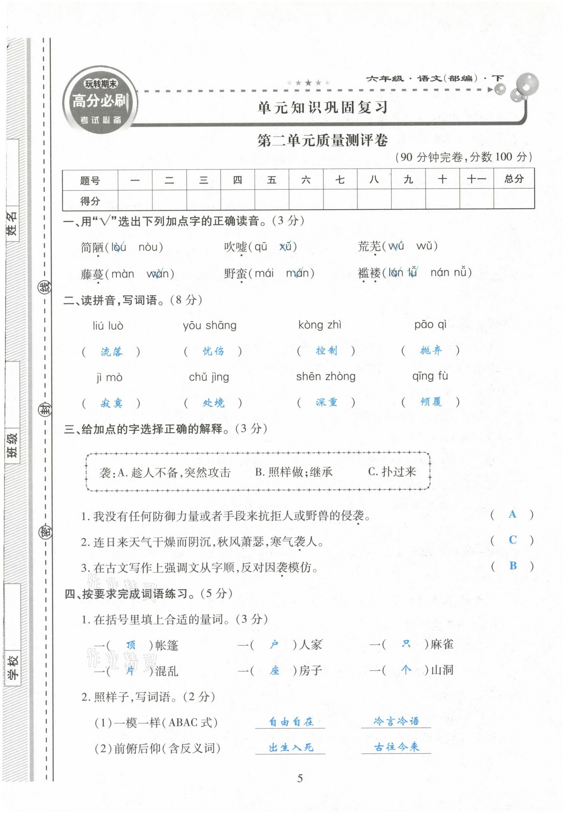 2021年玩转期末高分必刷六年级语文下册部编版