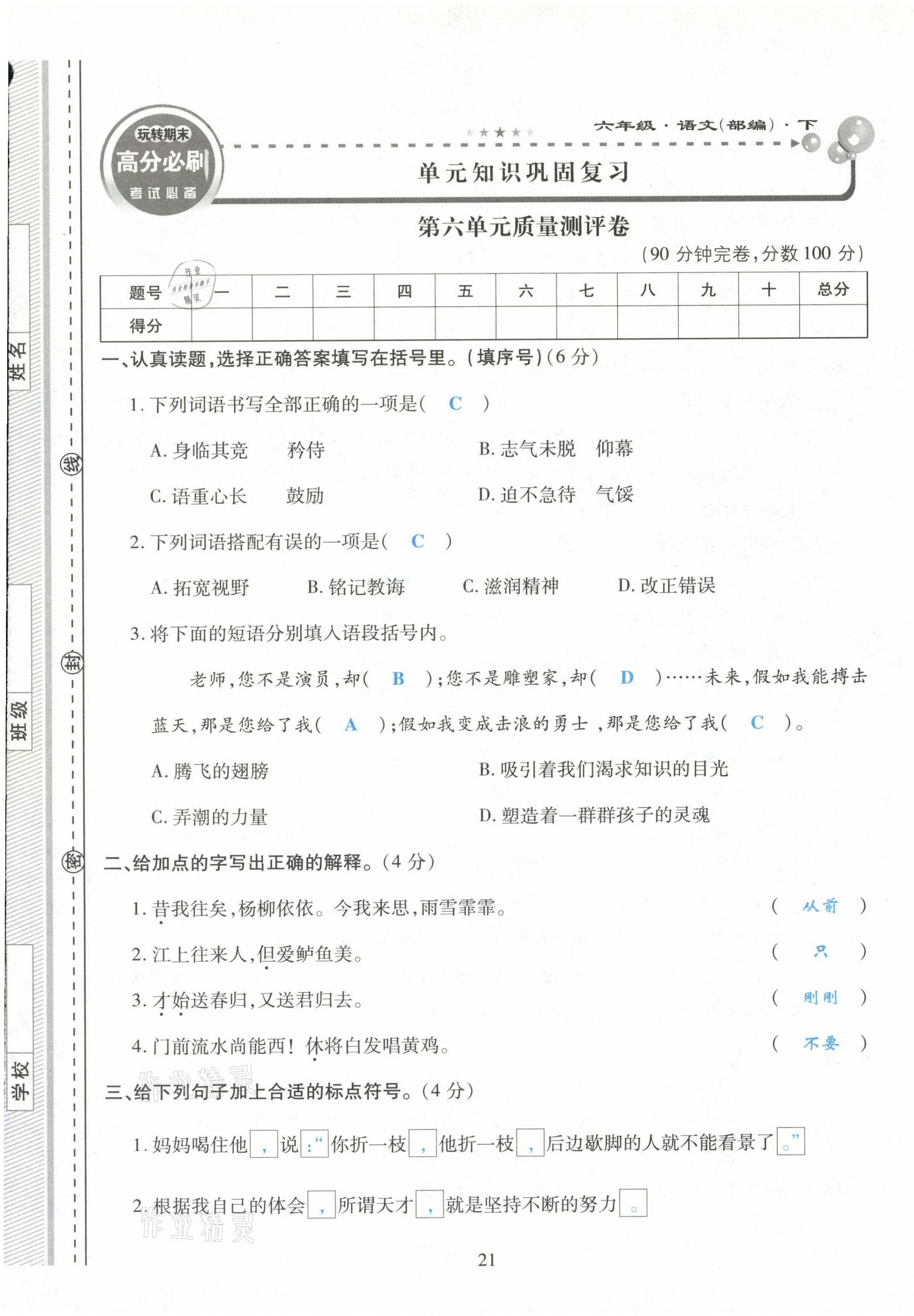 注:目前有些书本章节名称可能整理的还不是很完善,但都是按照顺序排列的,请同学们按照顺序仔细查找。练习册 2021年玩转期末高分必刷六年级语文下册部编版 答案主要是用来给同学们做完题方便对答案用的,请勿直接抄袭。
