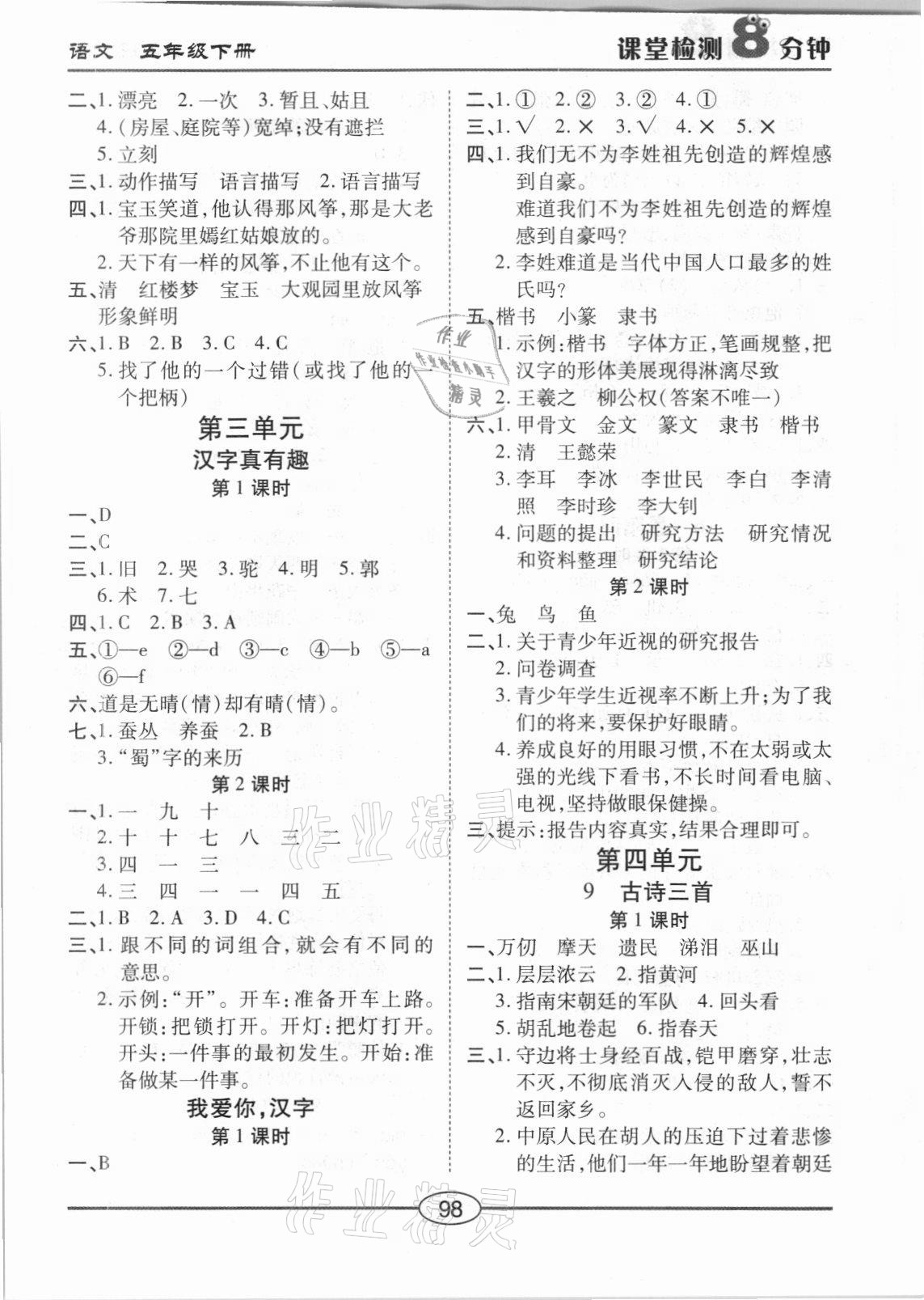 《2021年课堂检测8分钟五年级语文下册人教版》