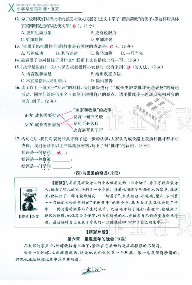 注:目前有些书本章节名称可能整理的还不是很完善,但都是按照顺序排列的,请同学们按照顺序仔细查找。练习册 2021年小学毕业特训卷语文温州专版 答案主要是用来给同学们做完题方便对答案用的,请勿直接抄袭。