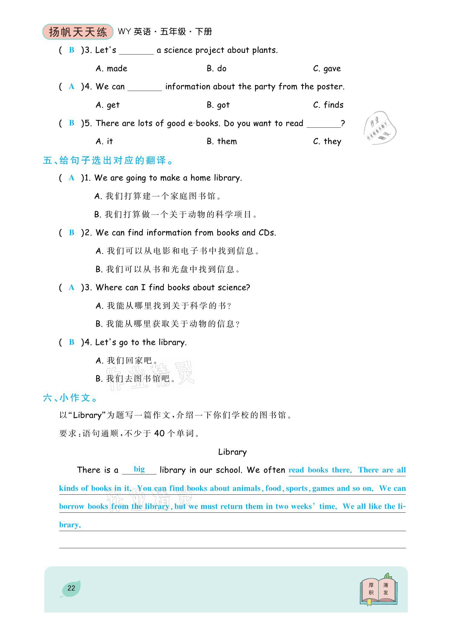 注:目前有些书本章节名称可能整理的还不是很完善,但都是按照顺序排列的,请同学们按照顺序仔细查找。练习册 2021年扬帆天天练五年级英语下册外研版 答案主要是用来给同学们做完题方便对答案用的,请勿直接抄袭。