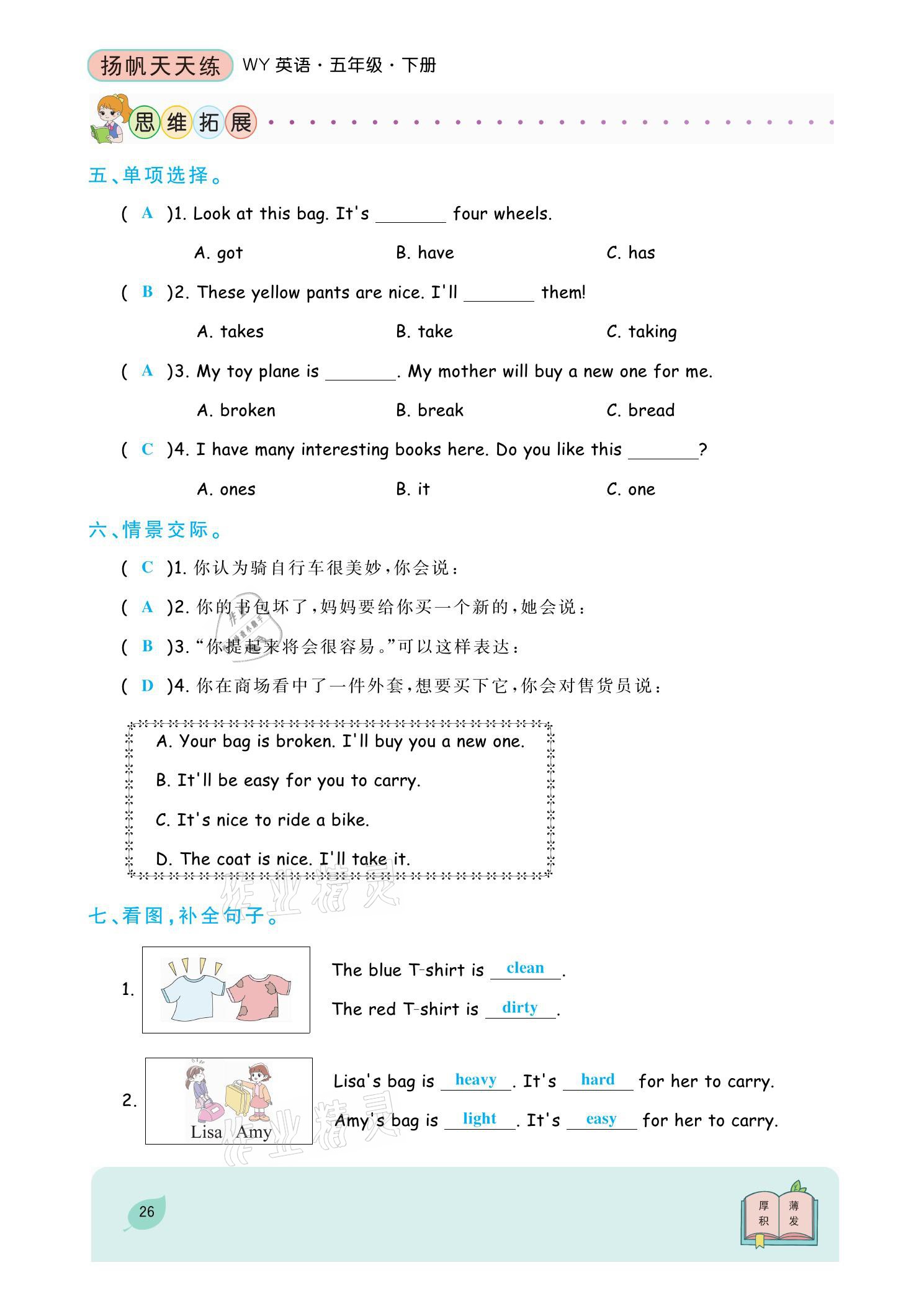 注:目前有些书本章节名称可能整理的还不是很完善,但都是按照顺序排列的,请同学们按照顺序仔细查找。练习册 2021年扬帆天天练五年级英语下册外研版 答案主要是用来给同学们做完题方便对答案用的,请勿直接抄袭。