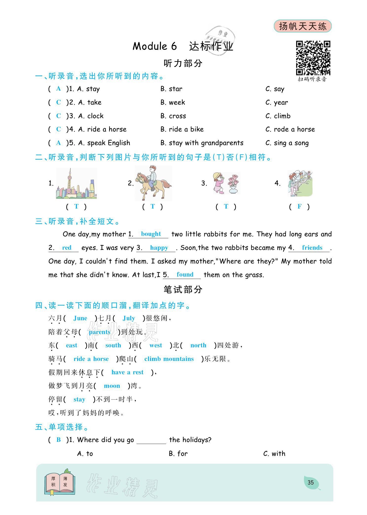 注:目前有些书本章节名称可能整理的还不是很完善,但都是按照顺序排列的,请同学们按照顺序仔细查找。练习册 2021年扬帆天天练五年级英语下册外研版 答案主要是用来给同学们做完题方便对答案用的,请勿直接抄袭。