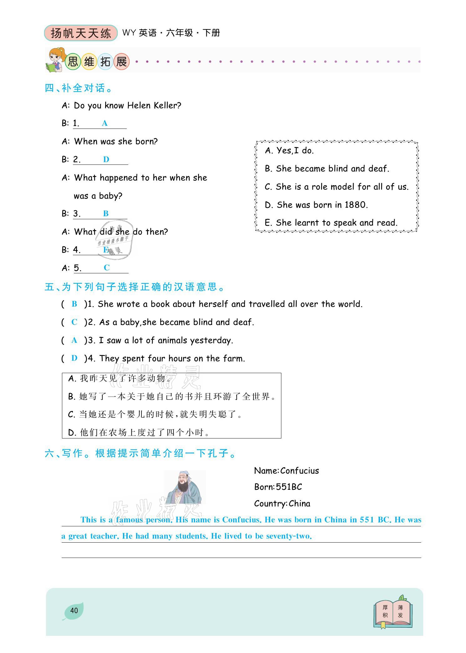 注:目前有些书本章节名称可能整理的还不是很完善,但都是按照顺序排列的,请同学们按照顺序仔细查找。练习册 2021年扬帆天天练六年级英语下册外研版 答案主要是用来给同学们做完题方便对答案用的,请勿直接抄袭。