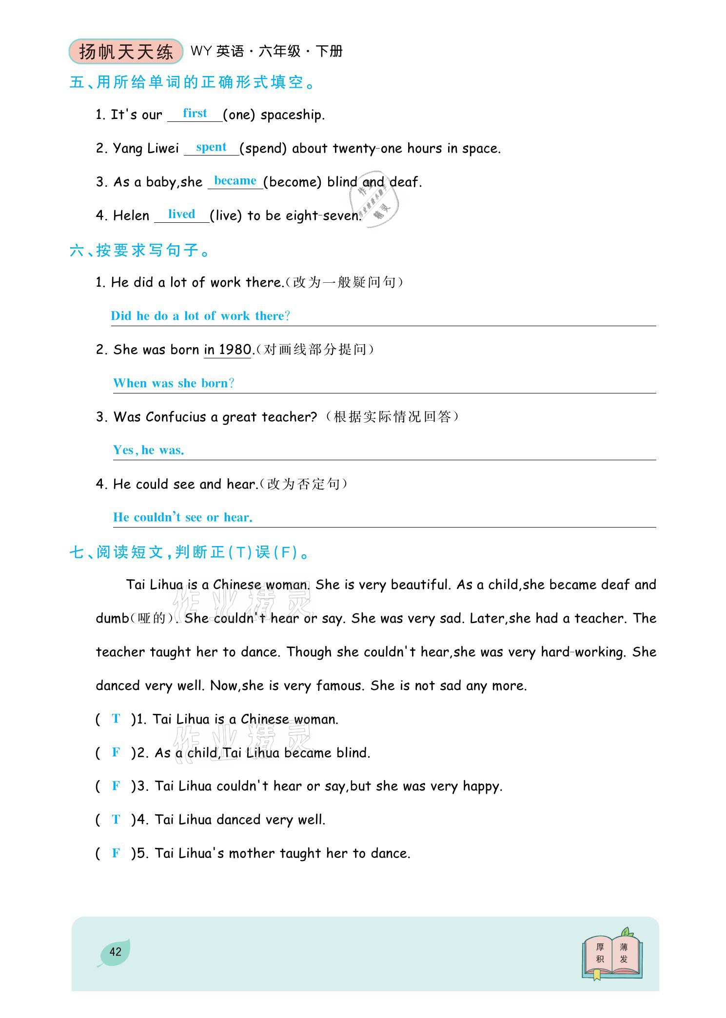 注:目前有些书本章节名称可能整理的还不是很完善,但都是按照顺序排列的,请同学们按照顺序仔细查找。练习册 2021年扬帆天天练六年级英语下册外研版 答案主要是用来给同学们做完题方便对答案用的,请勿直接抄袭。