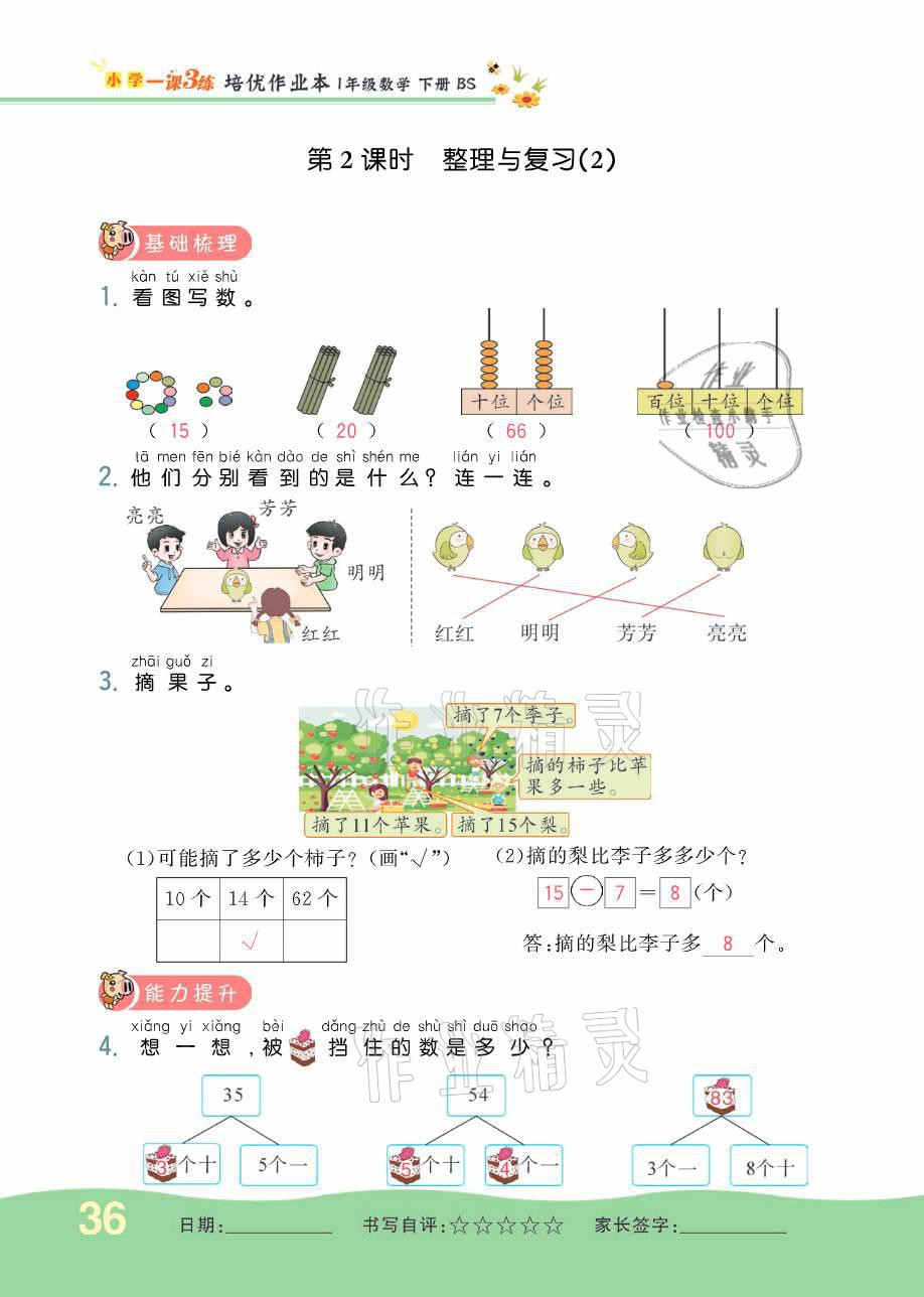 注:目前有些书本章节名称可能整理的还不是很完善,但都是按照顺序排列的,请同学们按照顺序仔细查找。练习册 2021年小学1课3练培优作业本一年级数学下册北师大版 答案主要是用来给同学们做完题方便对答案用的,请勿直接抄袭。