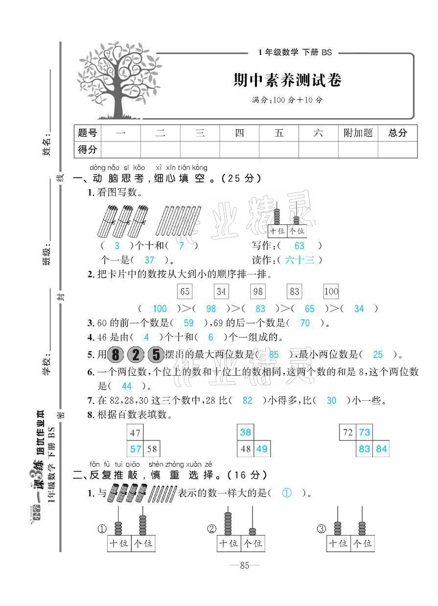 注:目前有些书本章节名称可能整理的还不是很完善,但都是按照顺序排列的,请同学们按照顺序仔细查找。练习册 2021年小学1课3练培优作业本一年级数学下册北师大版 答案主要是用来给同学们做完题方便对答案用的,请勿直接抄袭。