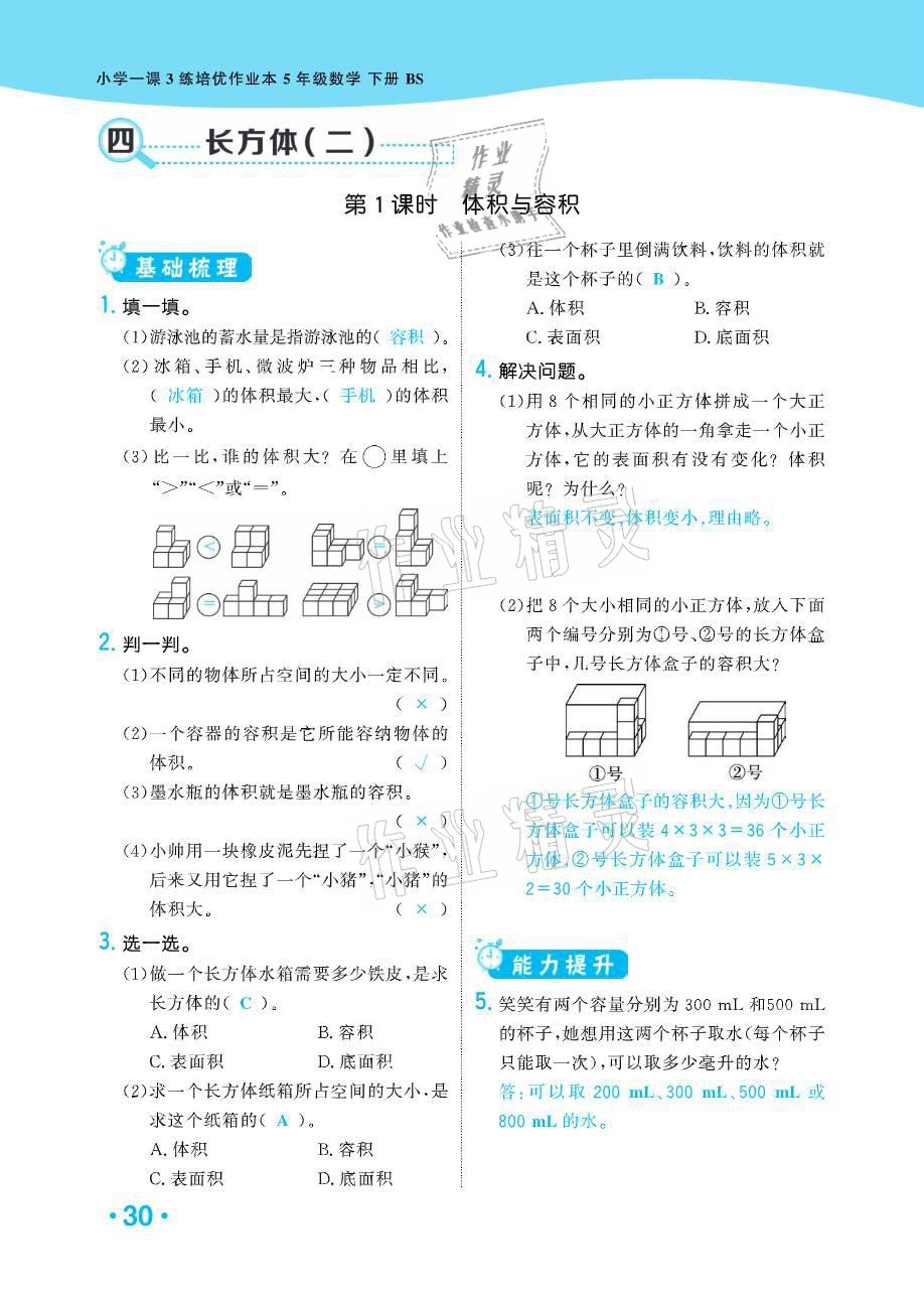 注:目前有些书本章节名称可能整理的还不是很完善,但都是按照顺序排列的,请同学们按照顺序仔细查找。练习册 2021年小学1课3练培优作业本五年级数学下册北师大版 答案主要是用来给同学们做完题方便对答案用的,请勿直接抄袭。