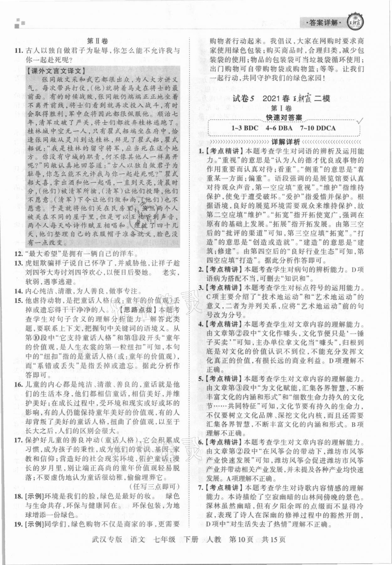 2021年王朝霞期末真题精编七年级语文下册人教版武汉专版