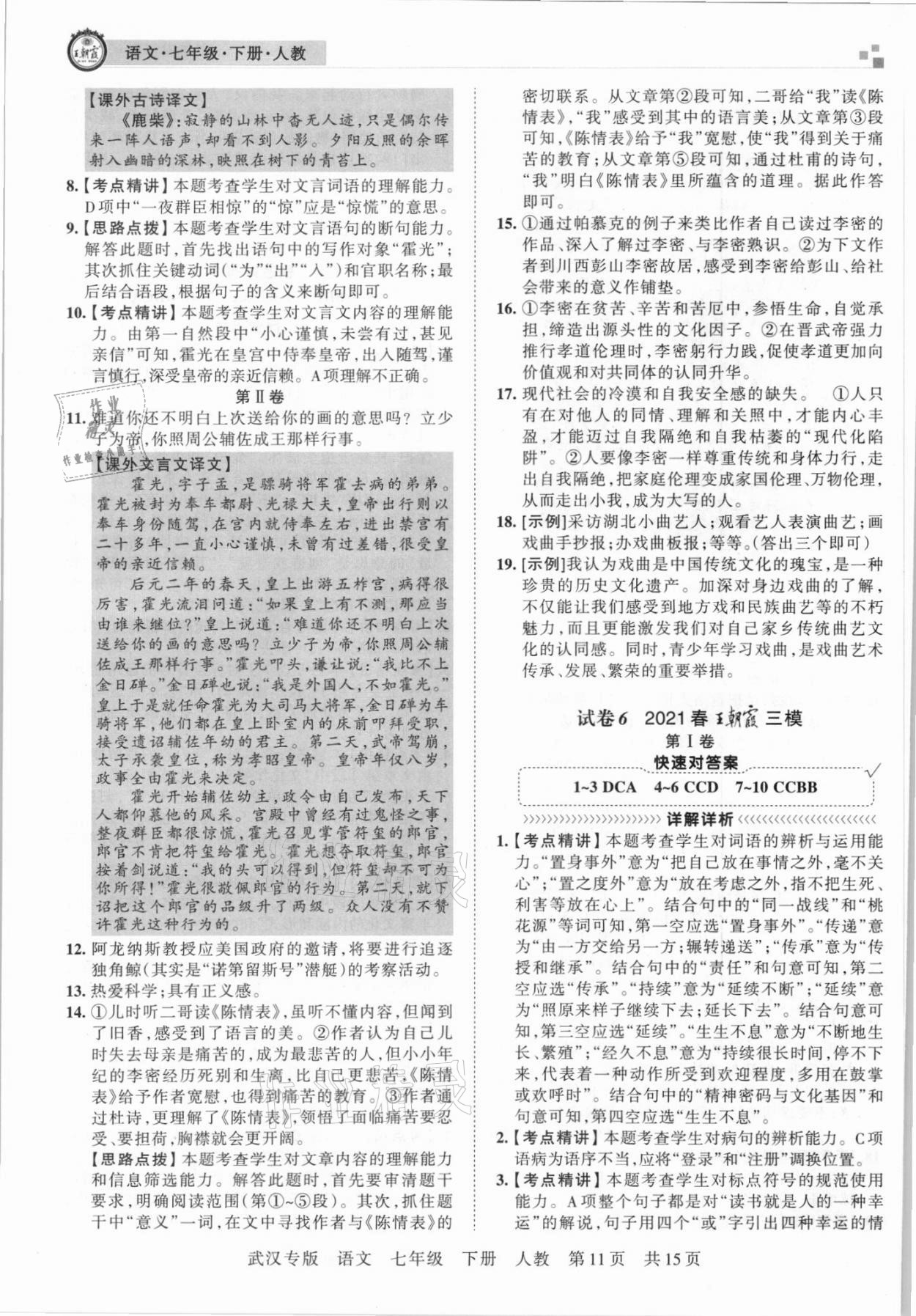 2021年王朝霞期末真题精编七年级语文下册人教版武汉专版