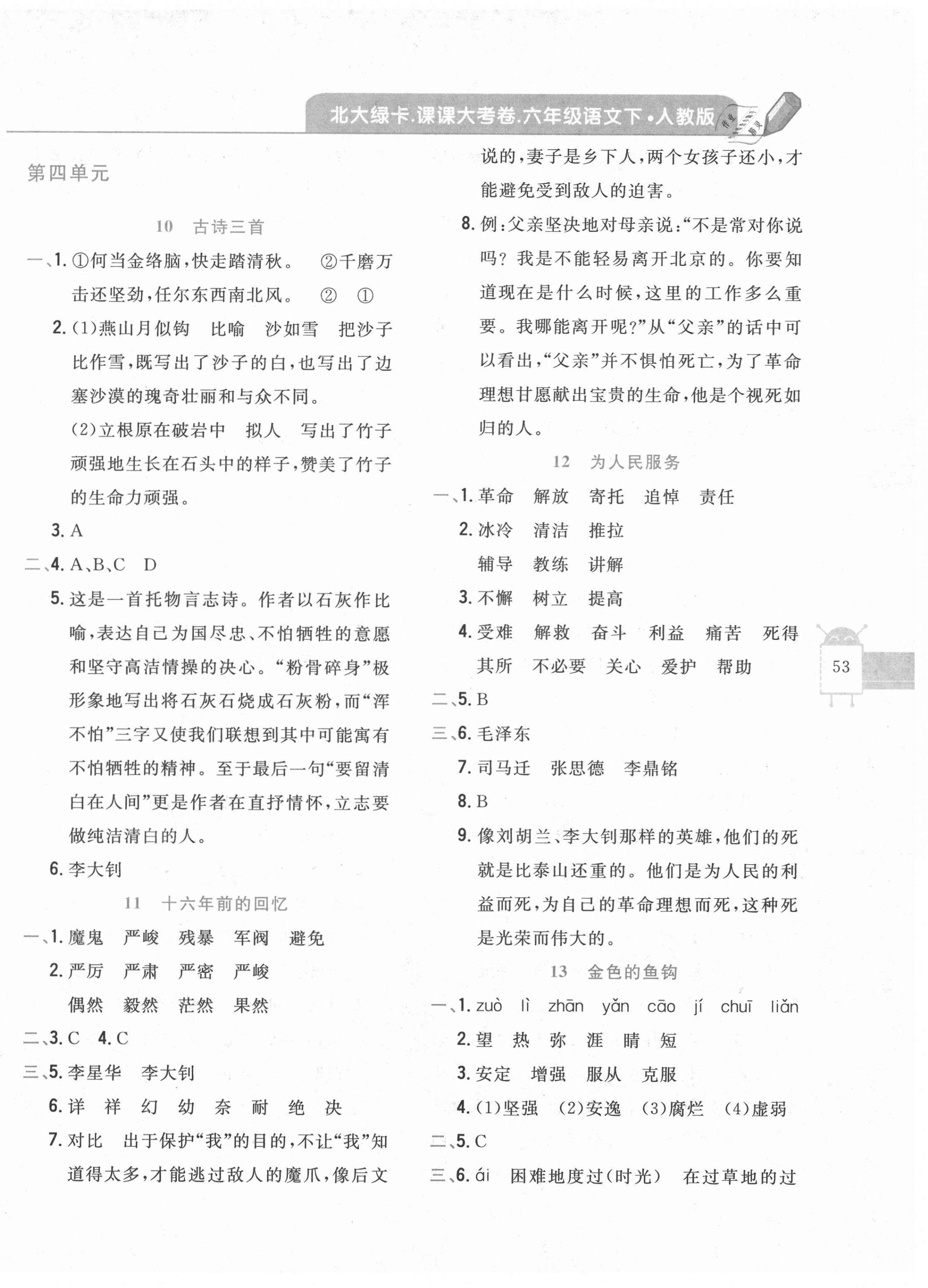 注:目前有些书本章节名称可能整理的还不是很完善,但都是按照顺序排列的,请同学们按照顺序仔细查找。练习册 2021年北大绿卡课课大考卷六年级语文下册人教版 答案主要是用来给同学们做完题方便对答案用的,请勿直接抄袭。