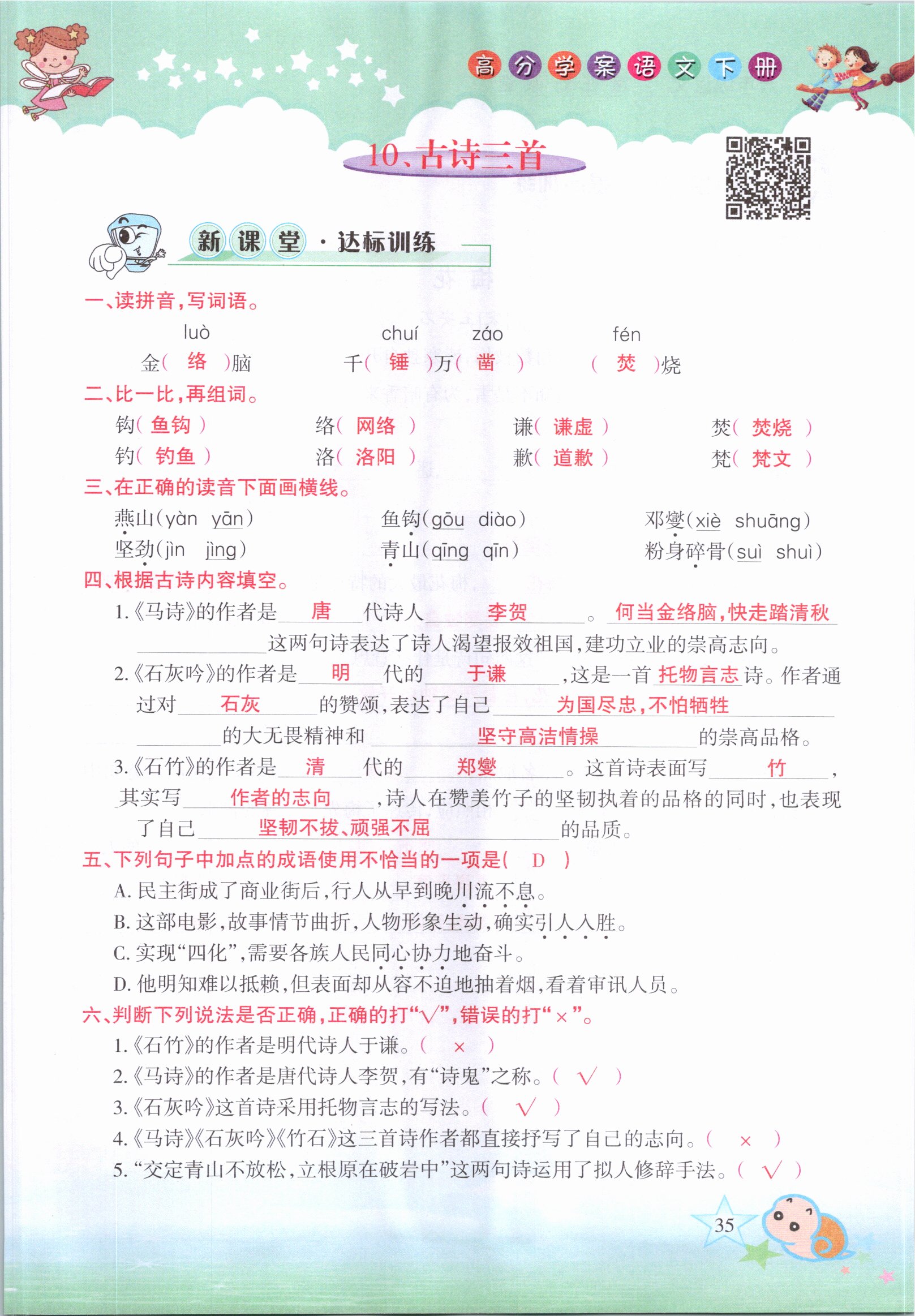 注:目前有些书本章节名称可能整理的还不是很完善,但都是按照顺序排列的,请同学们按照顺序仔细查找。练习册 2021年高分学案赢在新课堂六年级语文下册人教版 答案主要是用来给同学们做完题方便对答案用的,请勿直接抄袭。