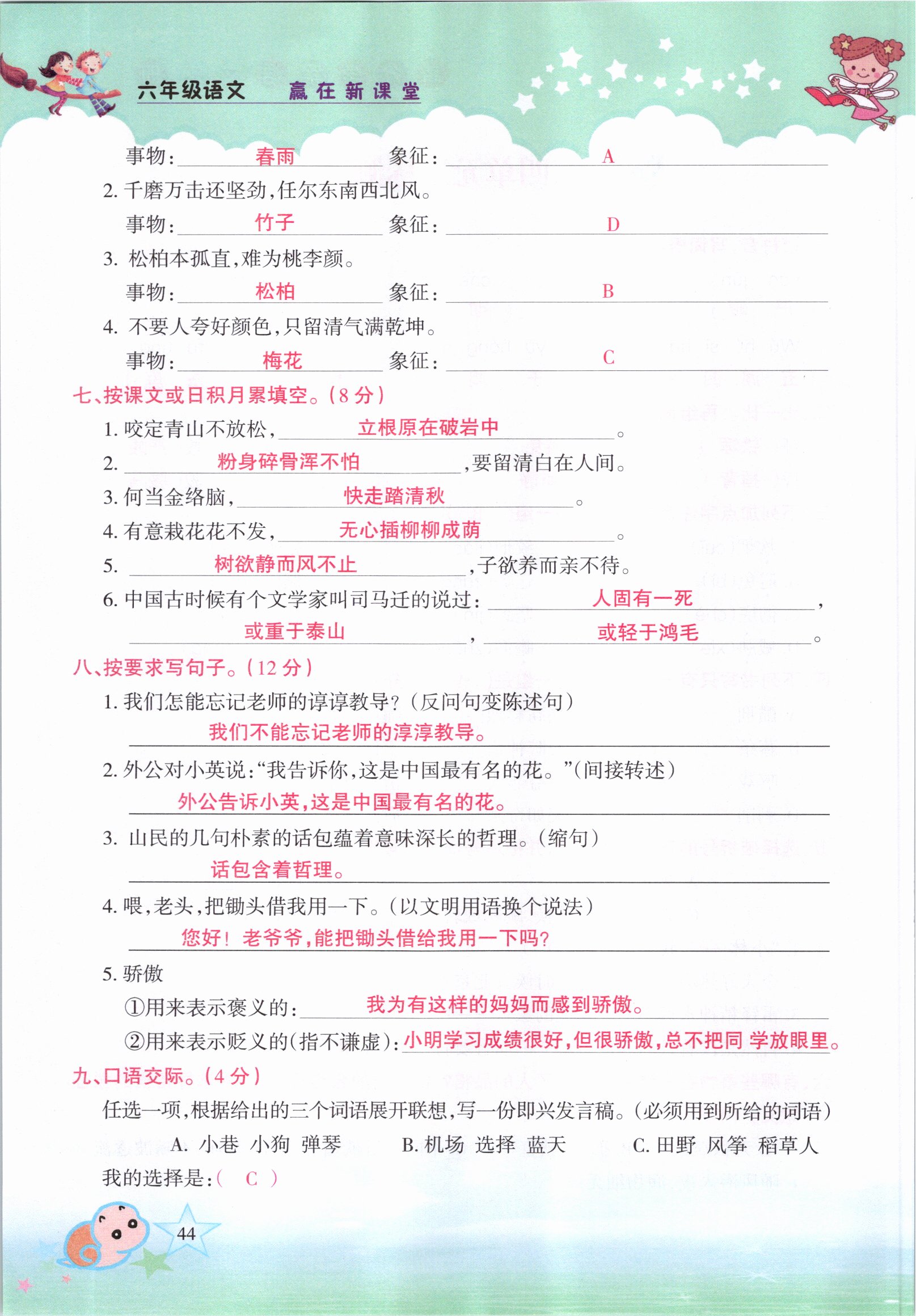 注:目前有些书本章节名称可能整理的还不是很完善,但都是按照顺序排列的,请同学们按照顺序仔细查找。练习册 2021年高分学案赢在新课堂六年级语文下册人教版 答案主要是用来给同学们做完题方便对答案用的,请勿直接抄袭。