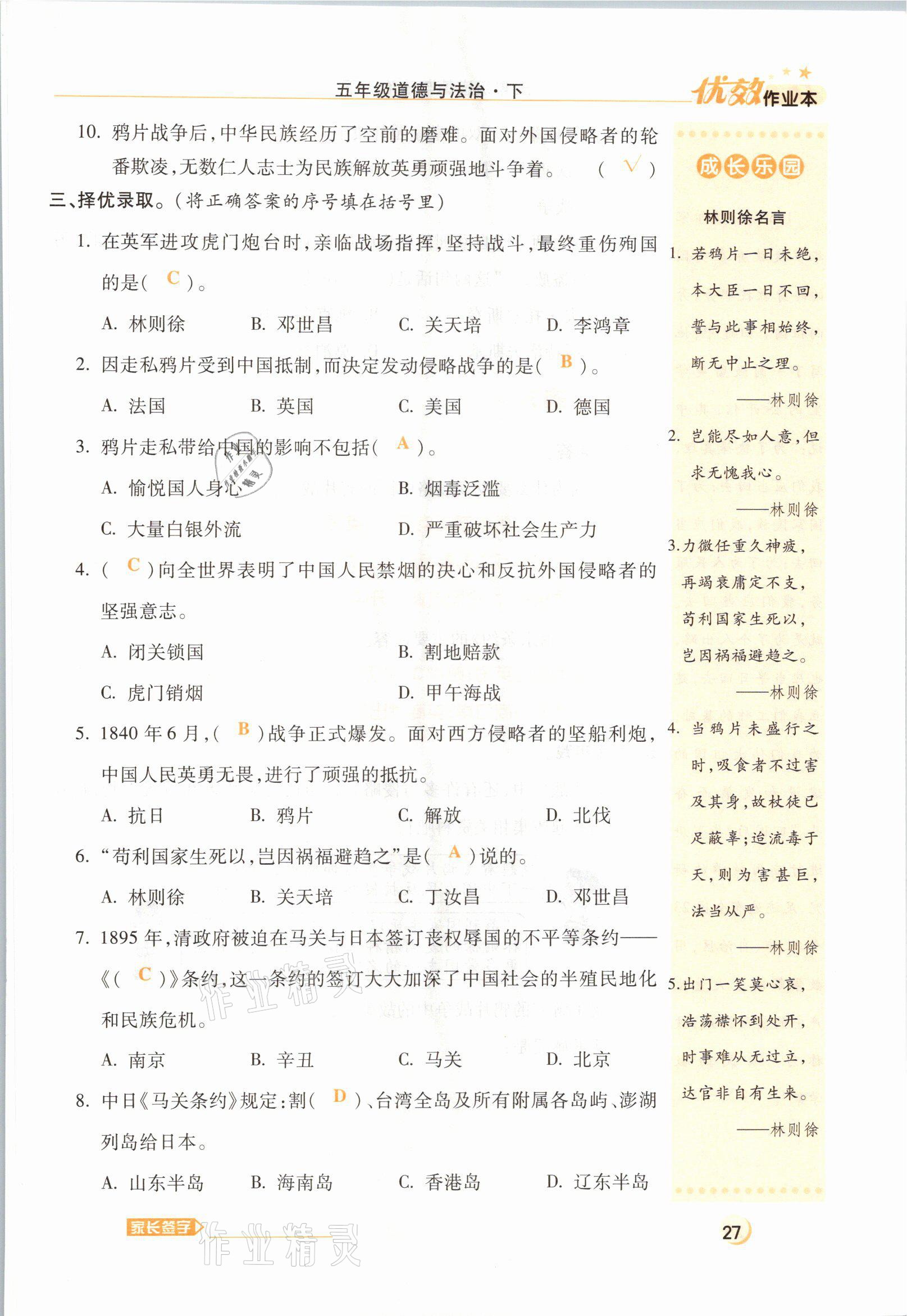 注:目前有些书本章节名称可能整理的还不是很完善,但都是按照顺序排列的,请同学们按照顺序仔细查找。练习册 2021年优效作业本五年级道德与法治下册部编版 答案主要是用来给同学们做完题方便对答案用的,请勿直接抄袭。