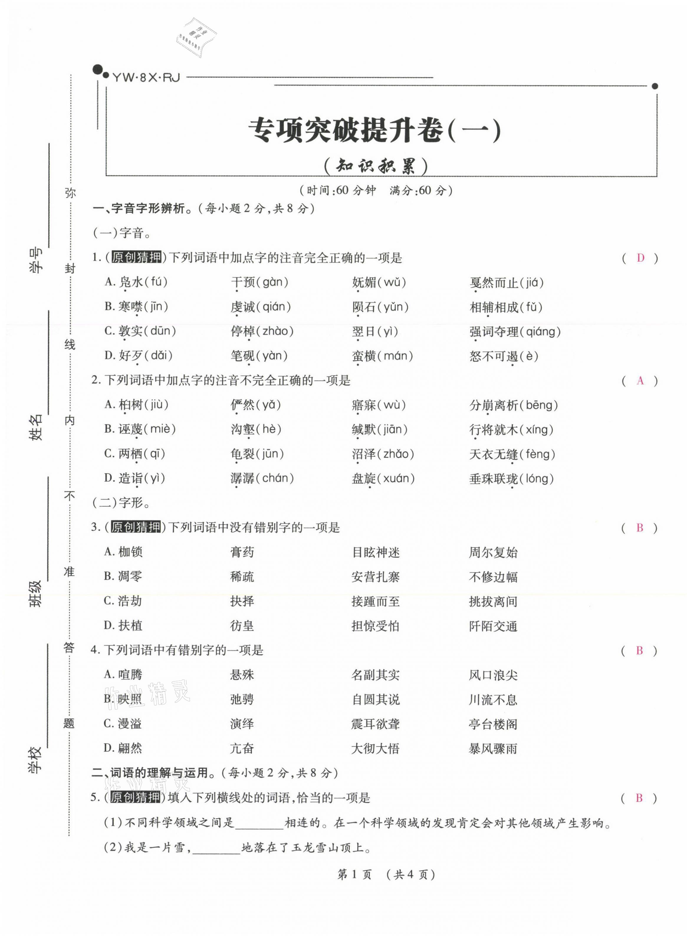 注:目前有些书本章节名称可能整理的还不是很完善,但都是按照顺序排列的,请同学们按照顺序仔细查找。练习册 2021年中考满分直通车核心金卷八年级语文下册人教版云南专版 答案主要是用来给同学们做完题方便对答案用的,请勿直接抄袭。