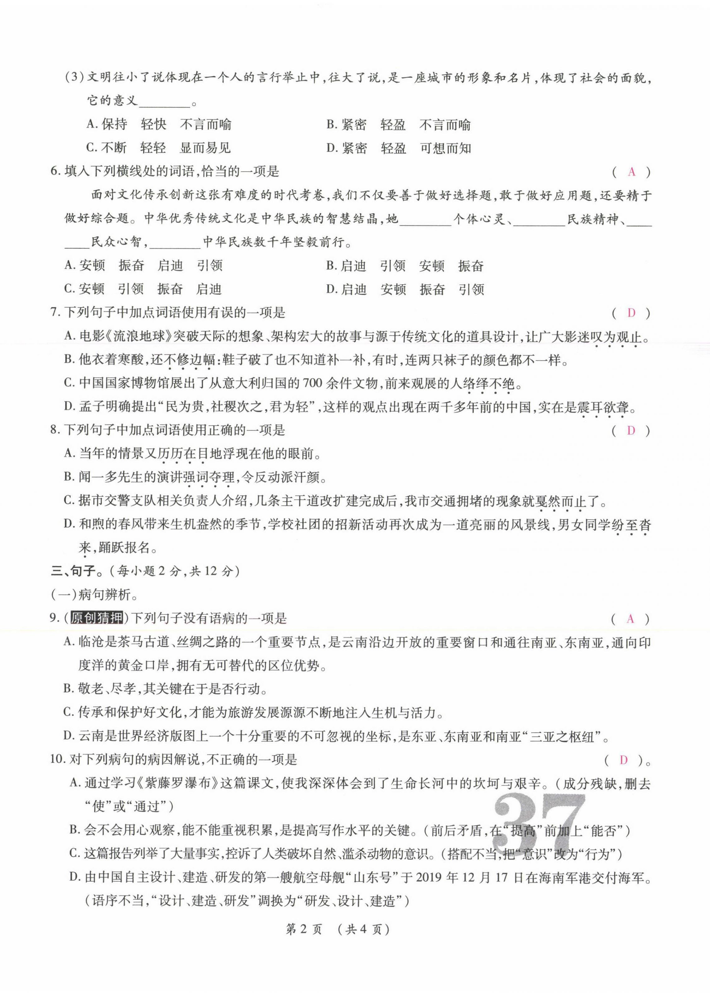 2021年中考满分直通车核心金卷八年级语文下册人教版云南专版