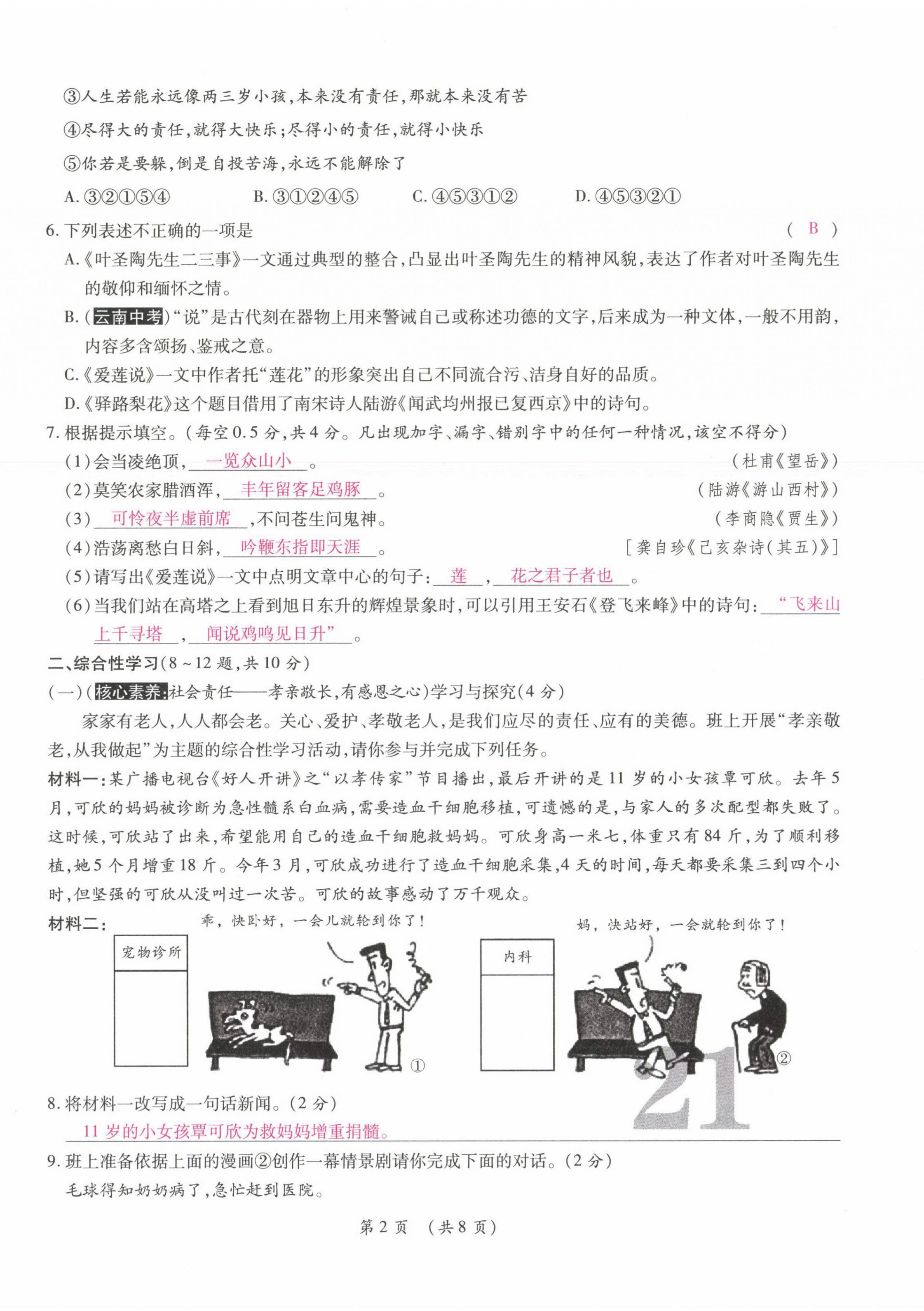 2021年中考满分直通车核心金卷七年级语文下册人教版云南专版