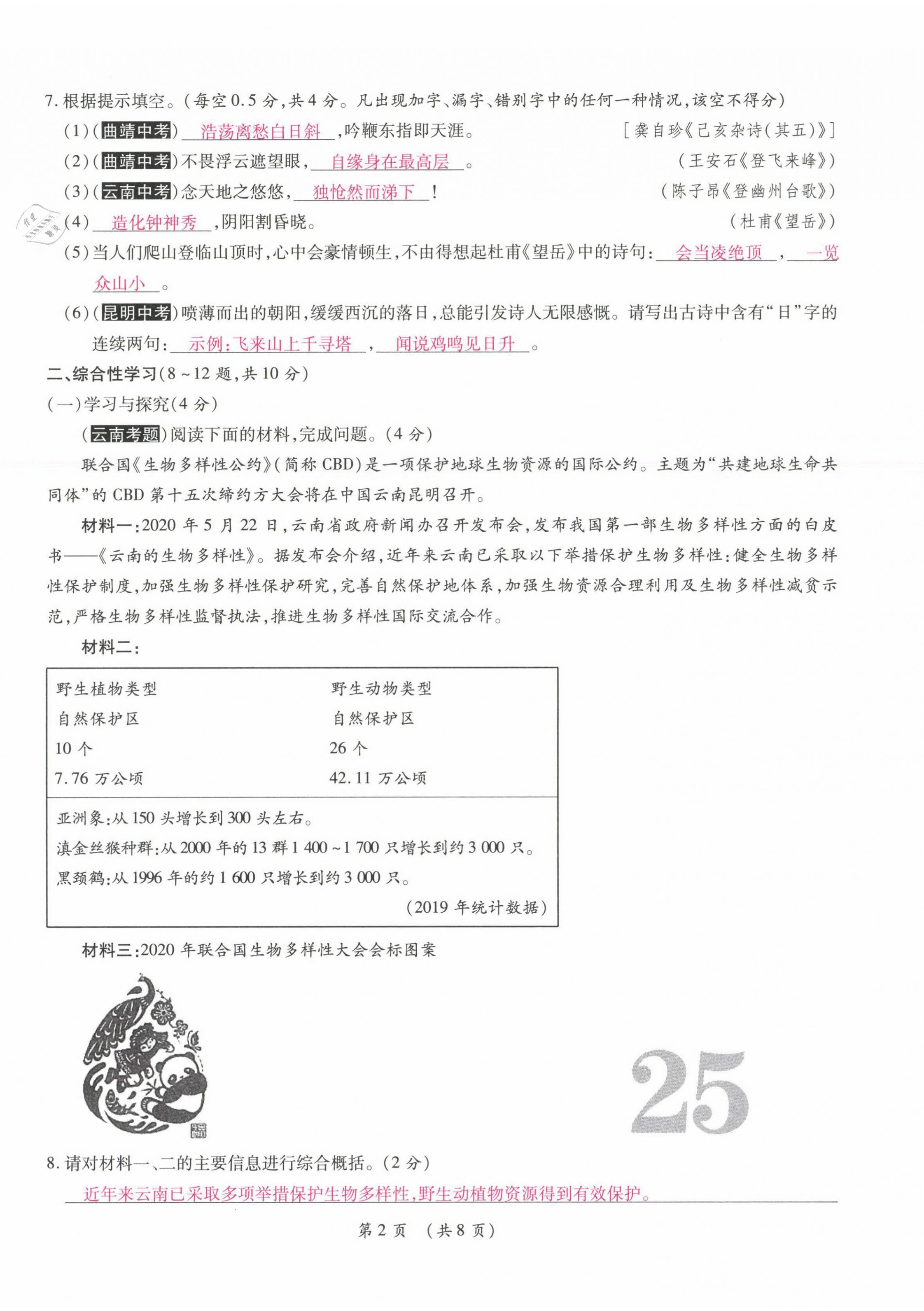 2021年中考满分直通车核心金卷七年级语文下册人教版云南专版