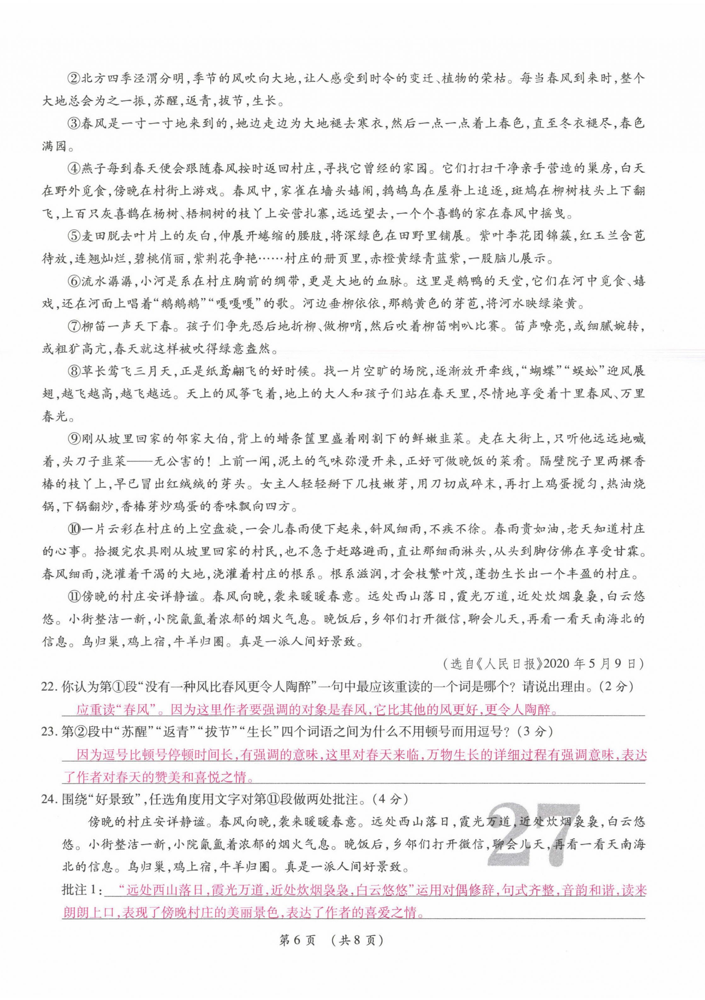 2021年中考满分直通车核心金卷七年级语文下册人教版云南专版