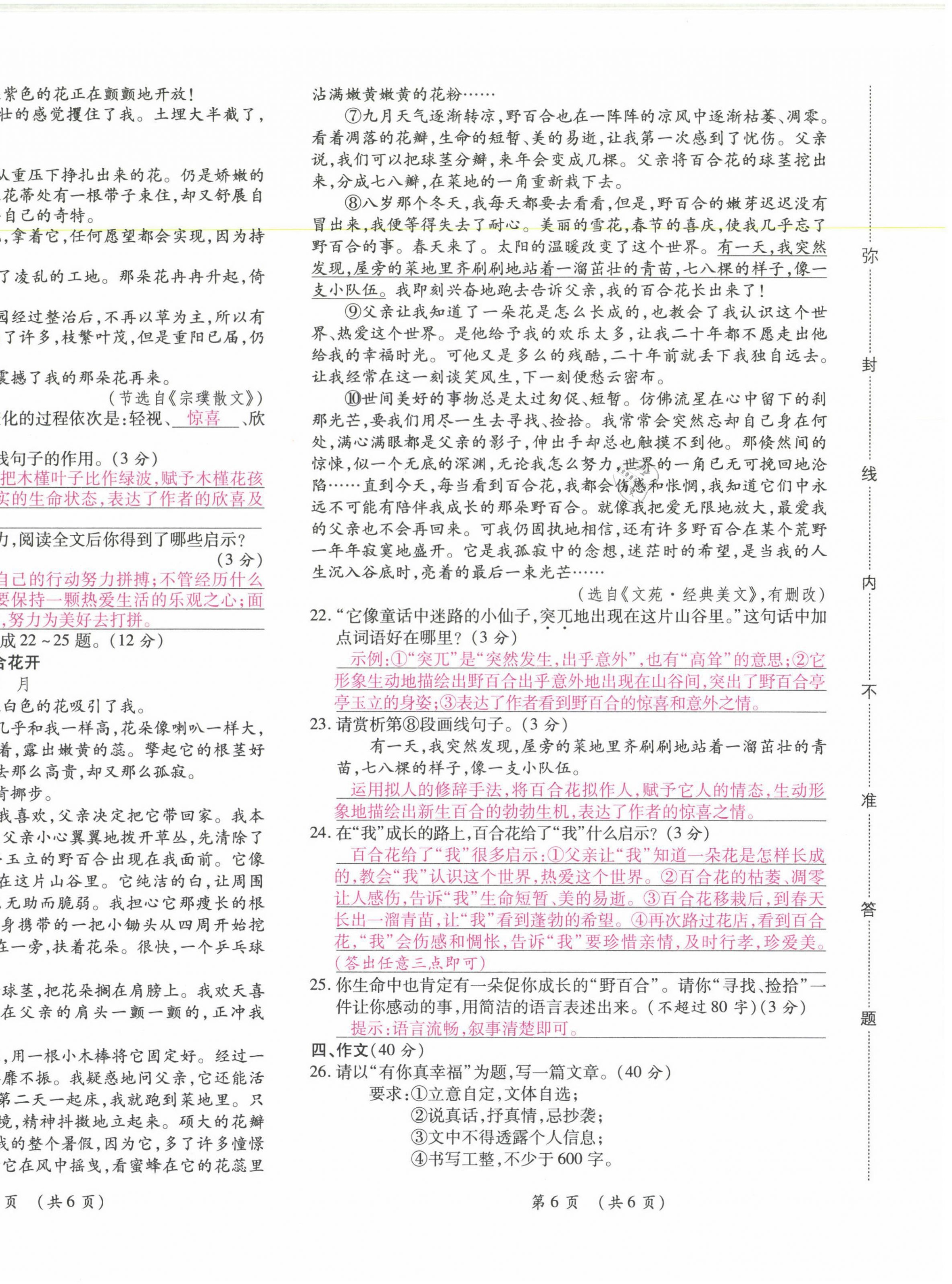 2021年中考满分直通车核心金卷七年级语文下册人教版云南专版
