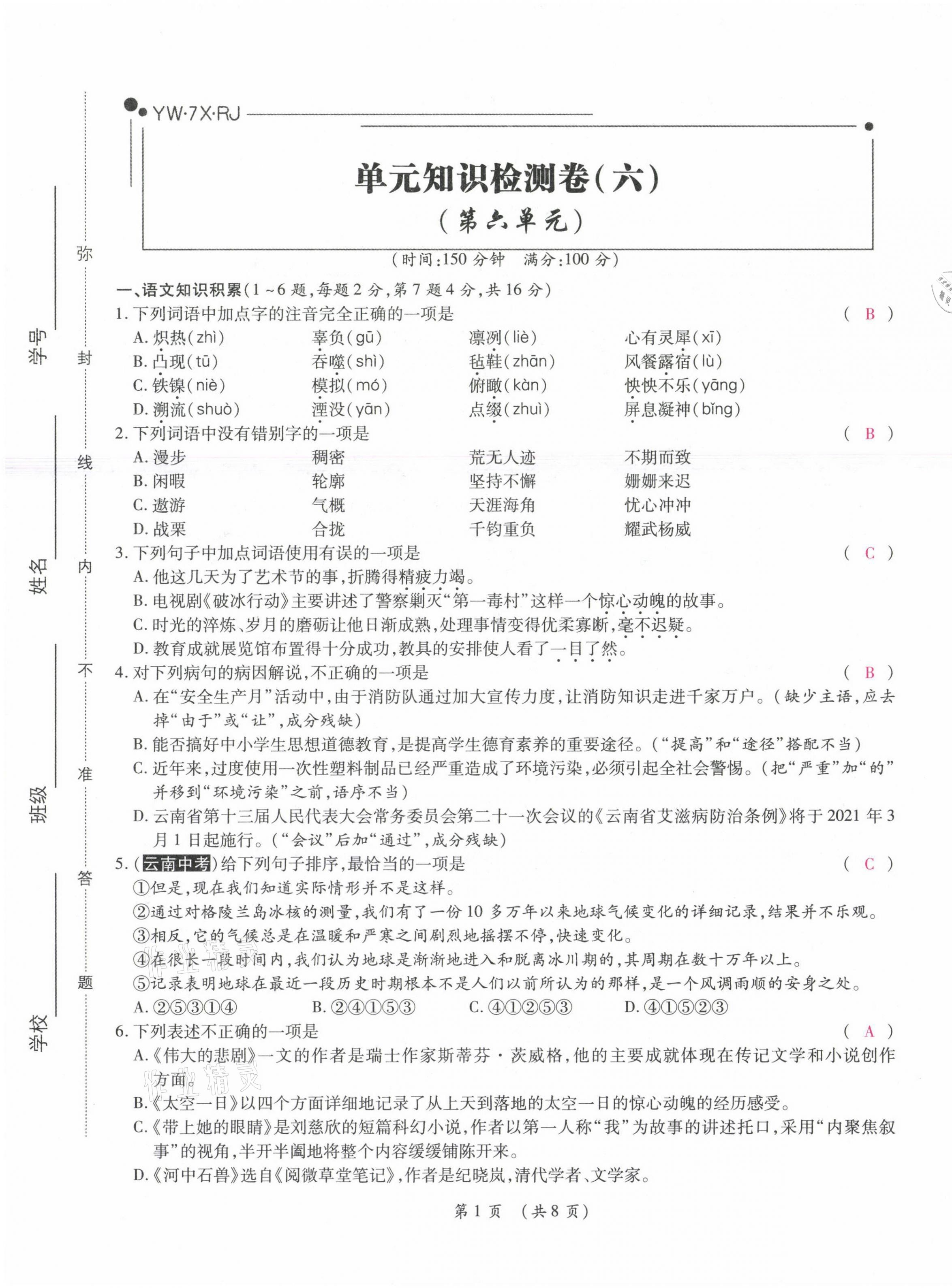 2021年中考满分直通车核心金卷七年级语文下册人教版云南专版