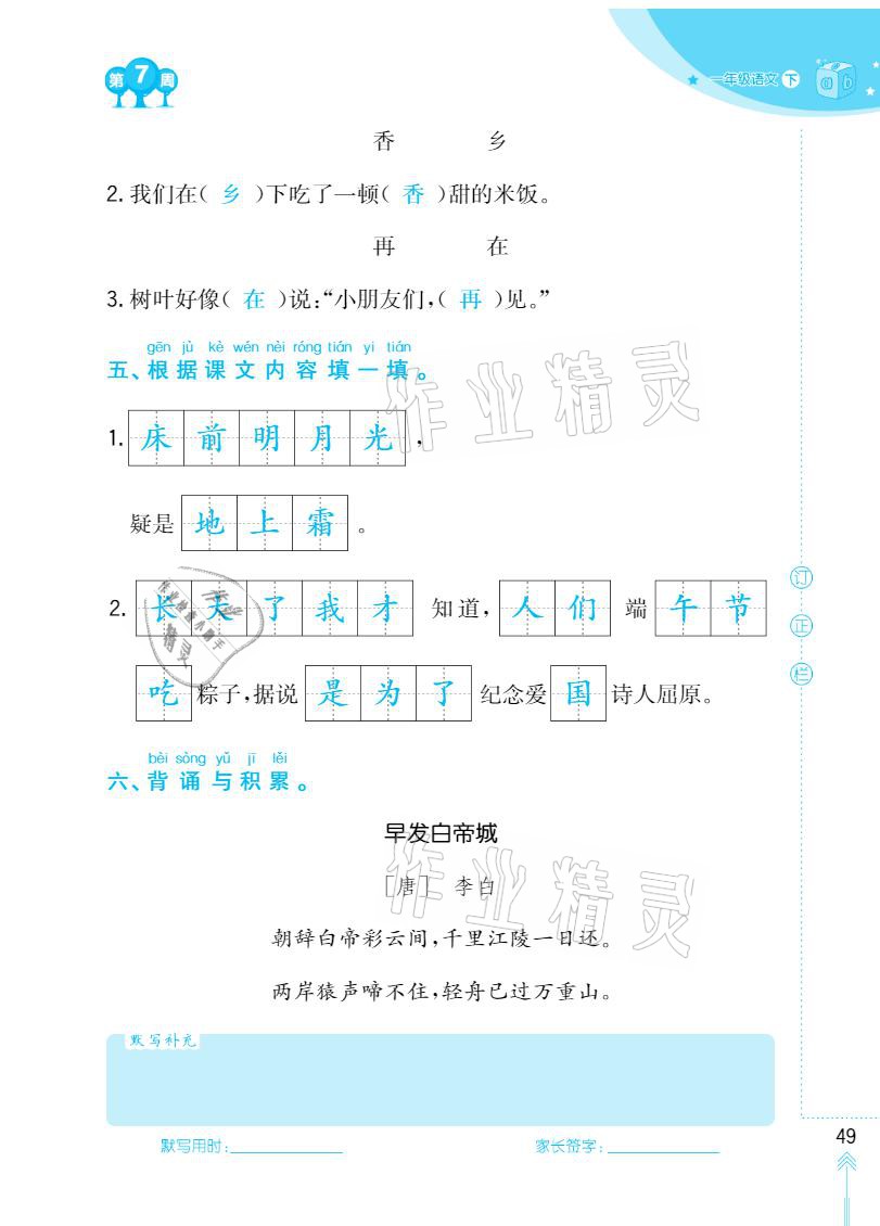 2021年默写小状元一年级下册长江少年儿童出版社