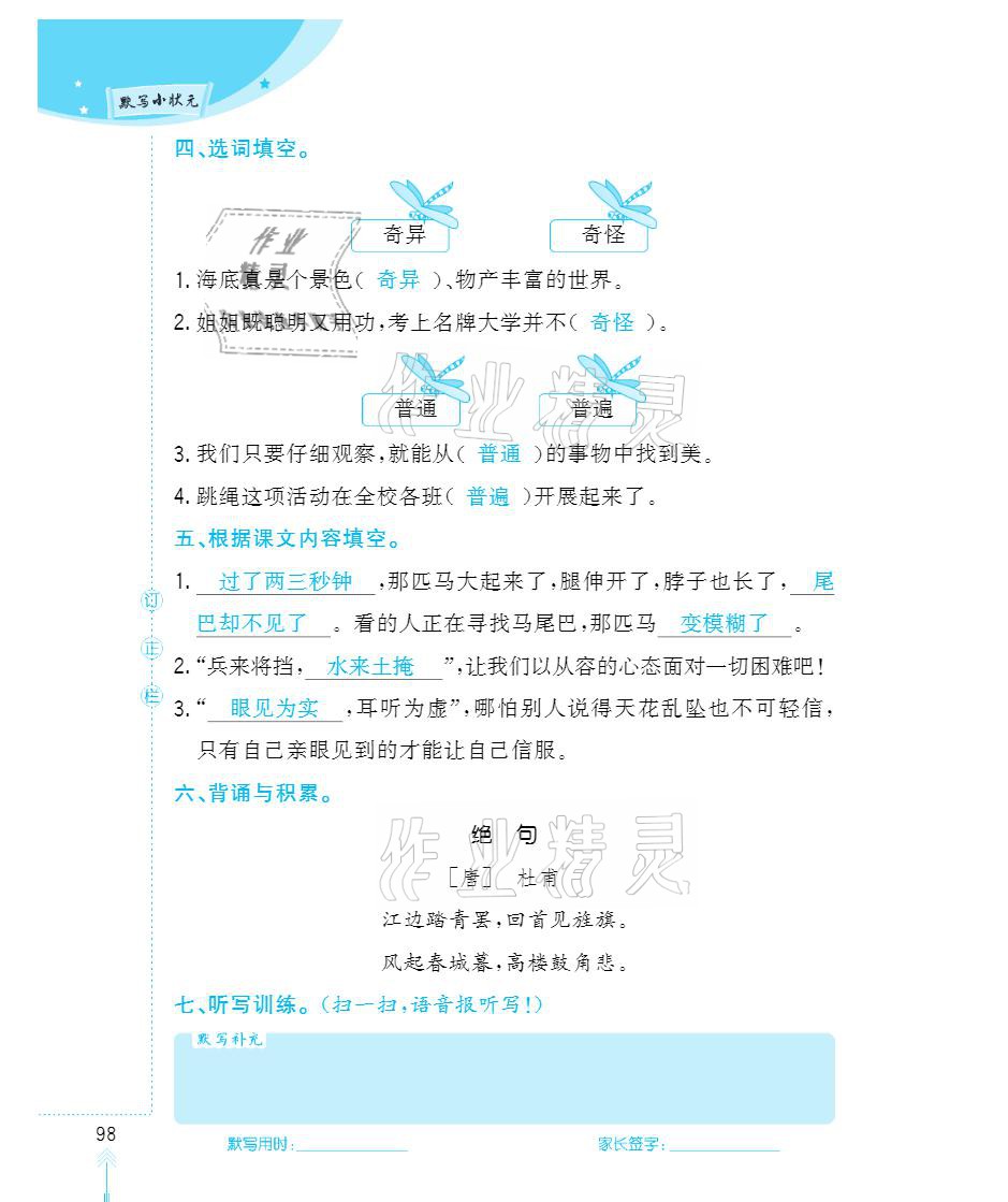 注:目前有些书本章节名称可能整理的还不是很完善,但都是按照顺序排列的,请同学们按照顺序仔细查找。练习册 2021年默写小状元三年级下册长江少年儿童出版社 答案主要是用来给同学们做完题方便对答案用的,请勿直接抄袭。