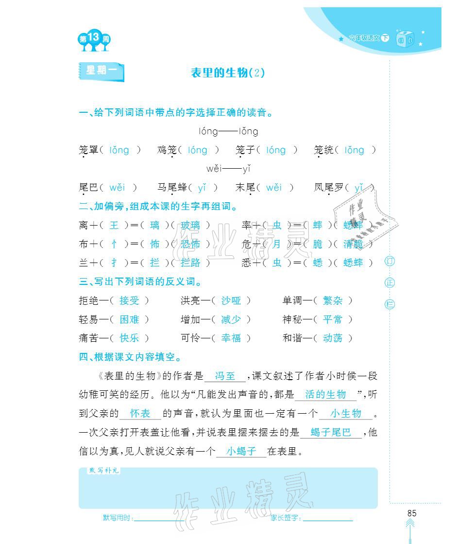 2021年默写小状元六年级下册长江少年儿童出版社