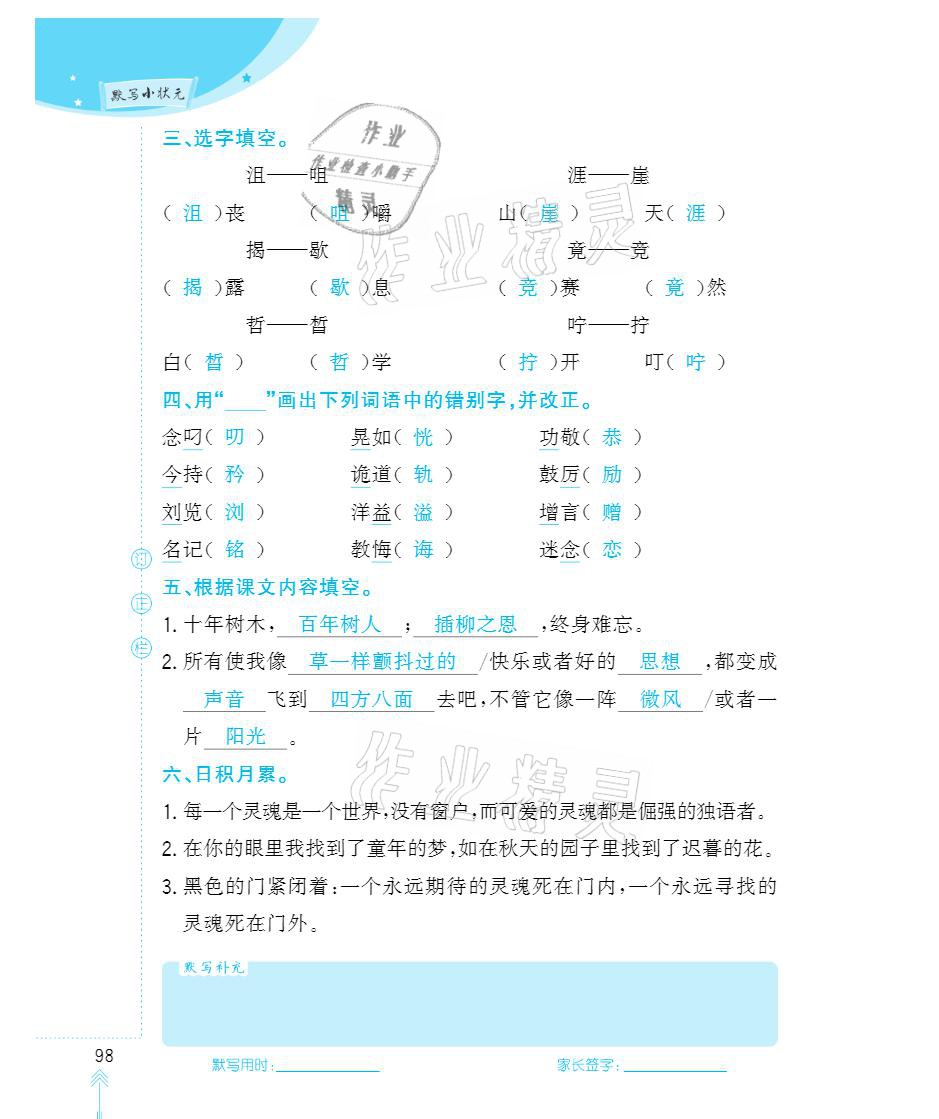 注:目前有些书本章节名称可能整理的还不是很完善,但都是按照顺序排列的,请同学们按照顺序仔细查找。练习册 2021年默写小状元六年级下册长江少年儿童出版社 答案主要是用来给同学们做完题方便对答案用的,请勿直接抄袭。