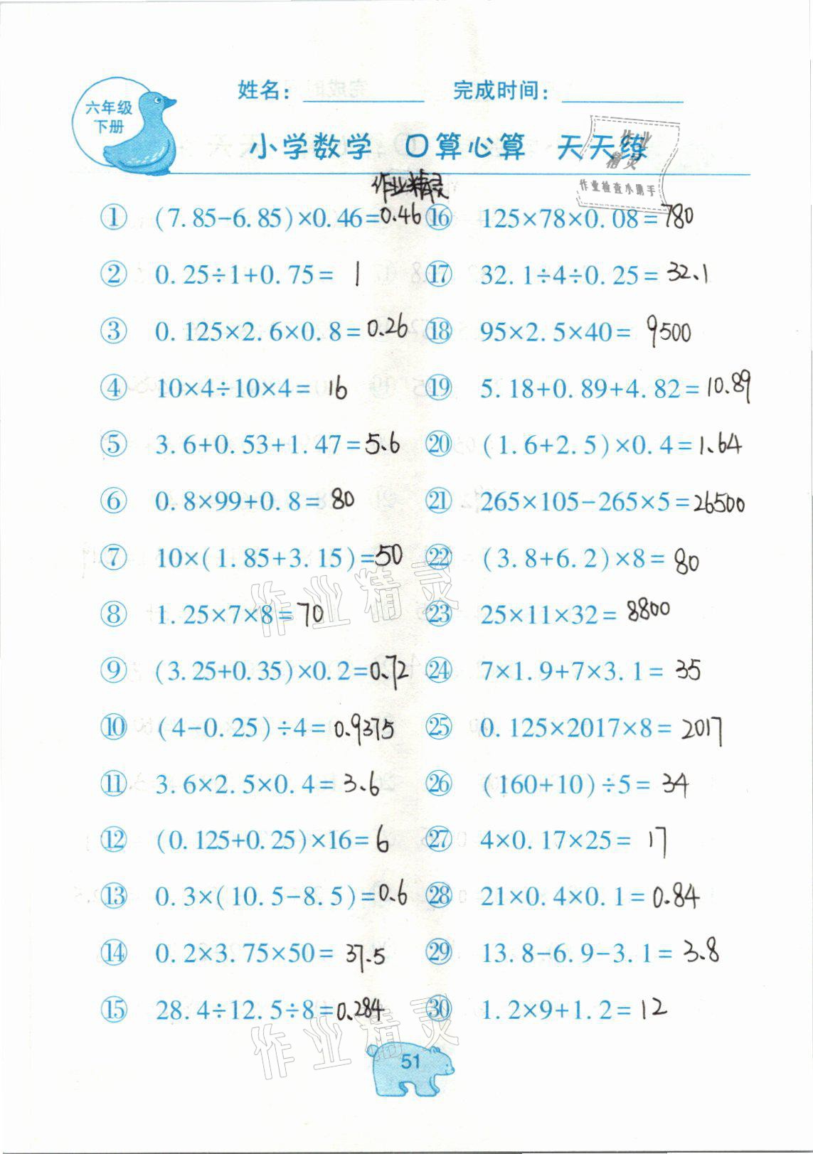 2021年文墨小学数学口算心算天天练六年级数学下册冀教版