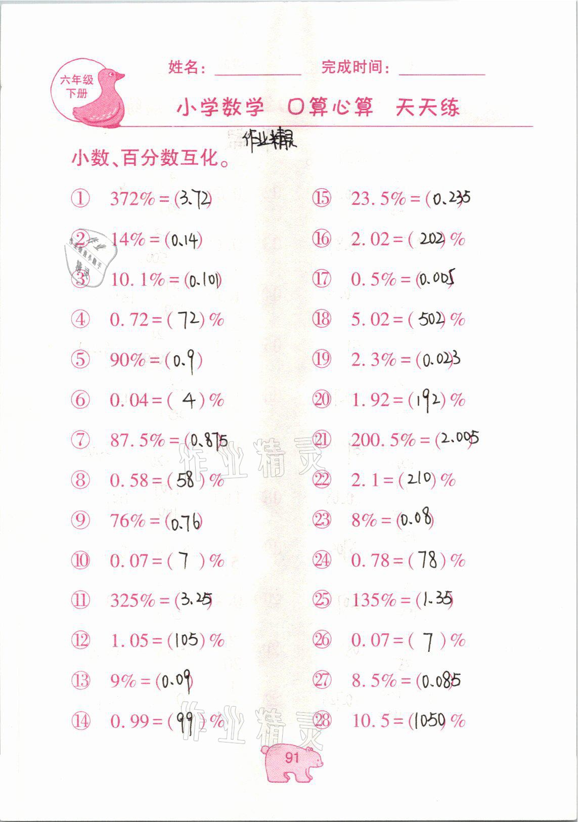2021年文墨小学数学口算心算天天练六年级数学下册冀教版