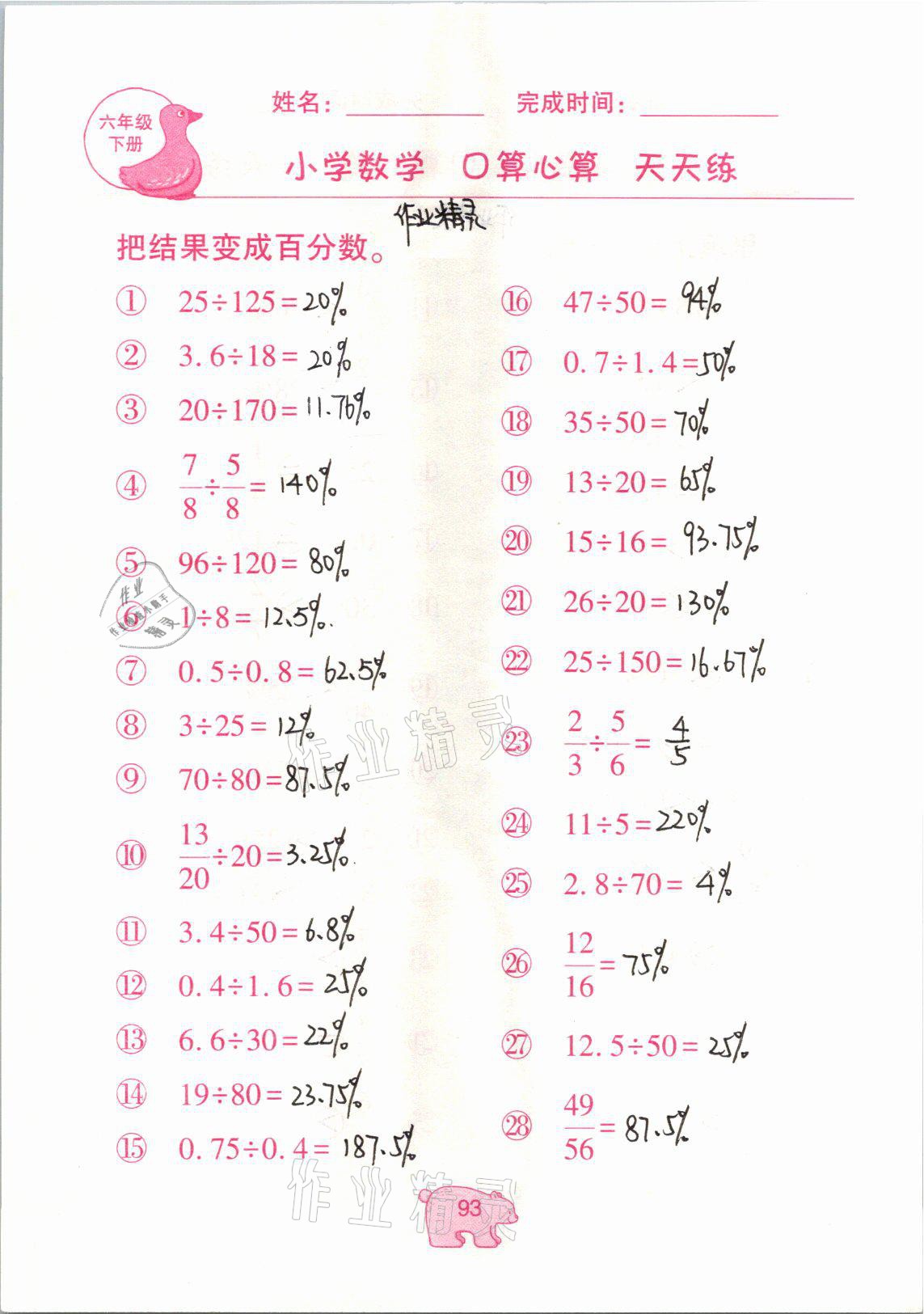 2021年文墨小学数学口算心算天天练六年级数学下册冀教版