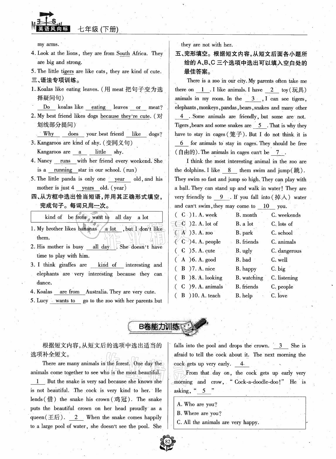 注:目前有些书本章节名称可能整理的还不是很完善,但都是按照顺序排列的,请同学们按照顺序仔细查找。练习册 2021年英语风向标七年级下册蓉城专版 答案主要是用来给同学们做完题方便对答案用的,请勿直接抄袭。