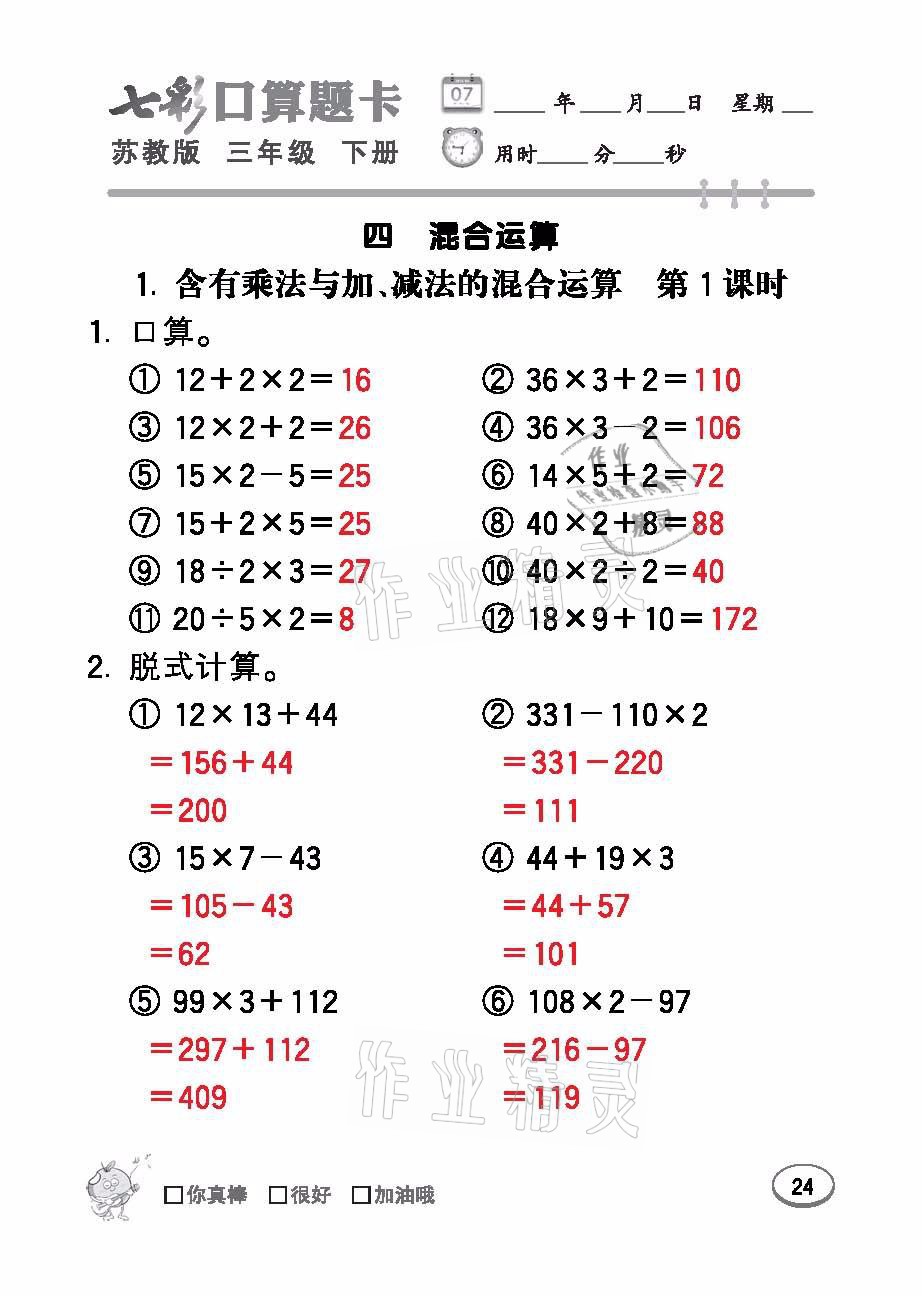 注:目前有些书本章节名称可能整理的还不是很完善,但都是按照顺序排列的,请同学们按照顺序仔细查找。练习册 2021年七彩口算题卡三年级数学下册苏教版 答案主要是用来给同学们做完题方便对答案用的,请勿直接抄袭。