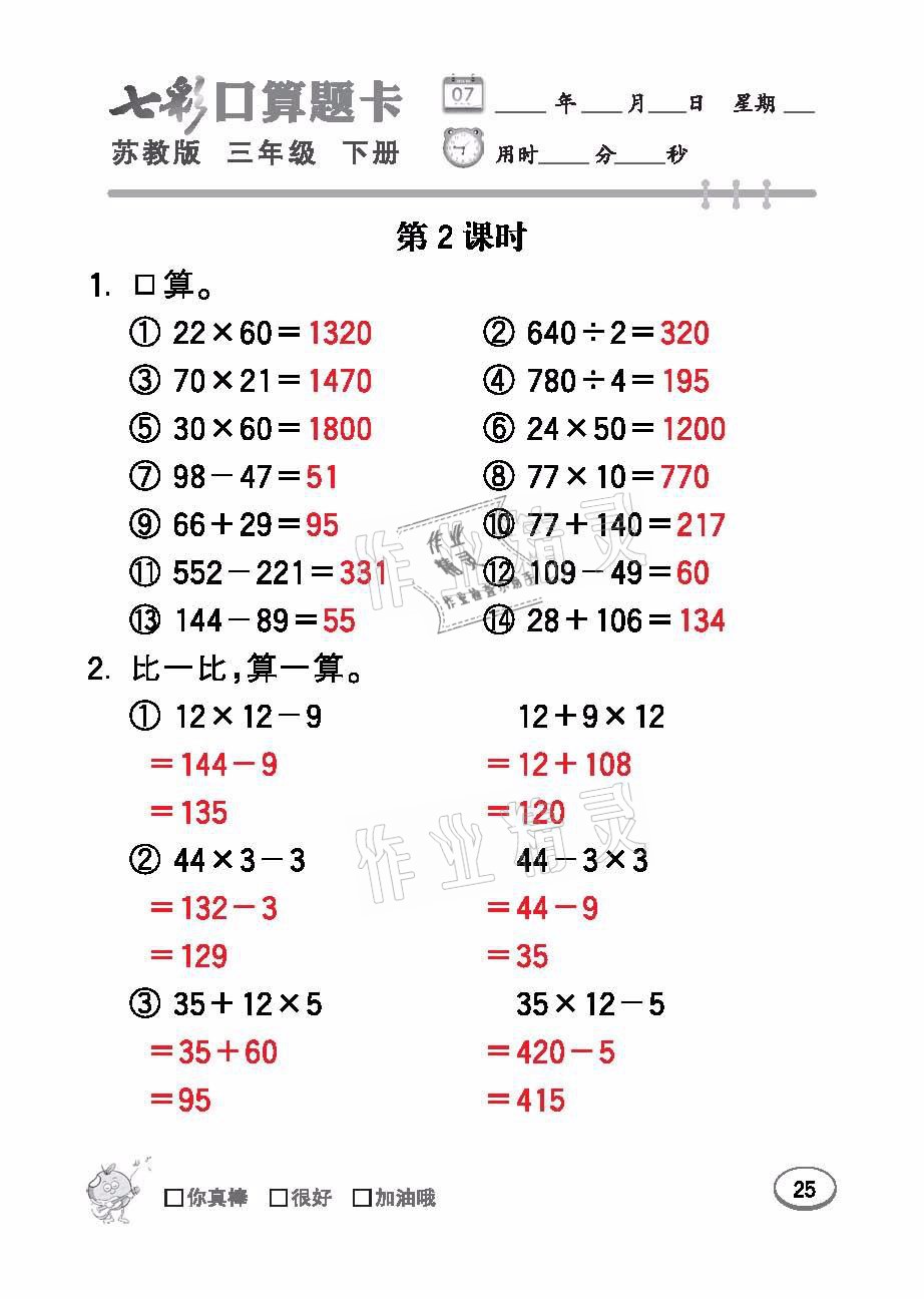 注:目前有些书本章节名称可能整理的还不是很完善,但都是按照顺序排列的,请同学们按照顺序仔细查找。练习册 2021年七彩口算题卡三年级数学下册苏教版 答案主要是用来给同学们做完题方便对答案用的,请勿直接抄袭。