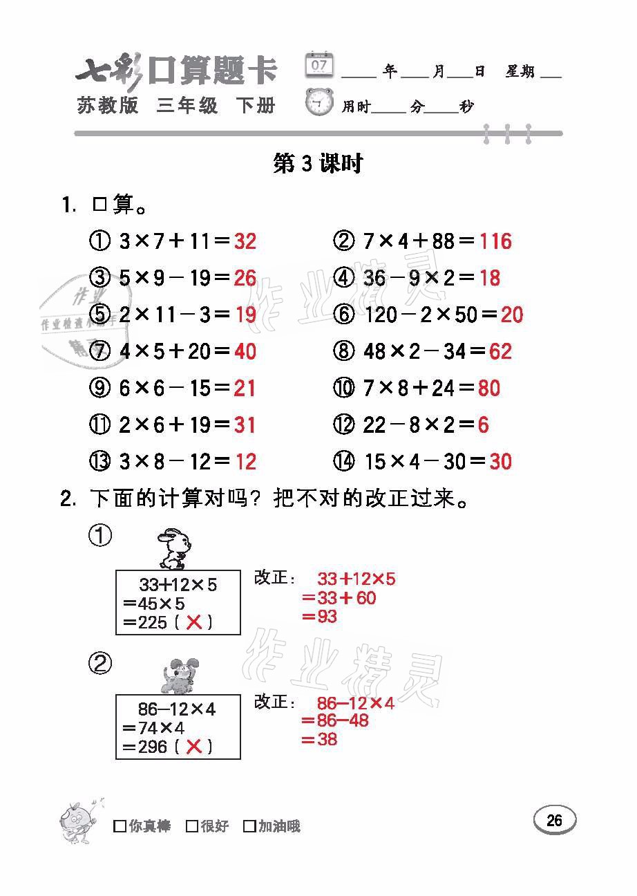 注:目前有些书本章节名称可能整理的还不是很完善,但都是按照顺序排列的,请同学们按照顺序仔细查找。练习册 2021年七彩口算题卡三年级数学下册苏教版 答案主要是用来给同学们做完题方便对答案用的,请勿直接抄袭。