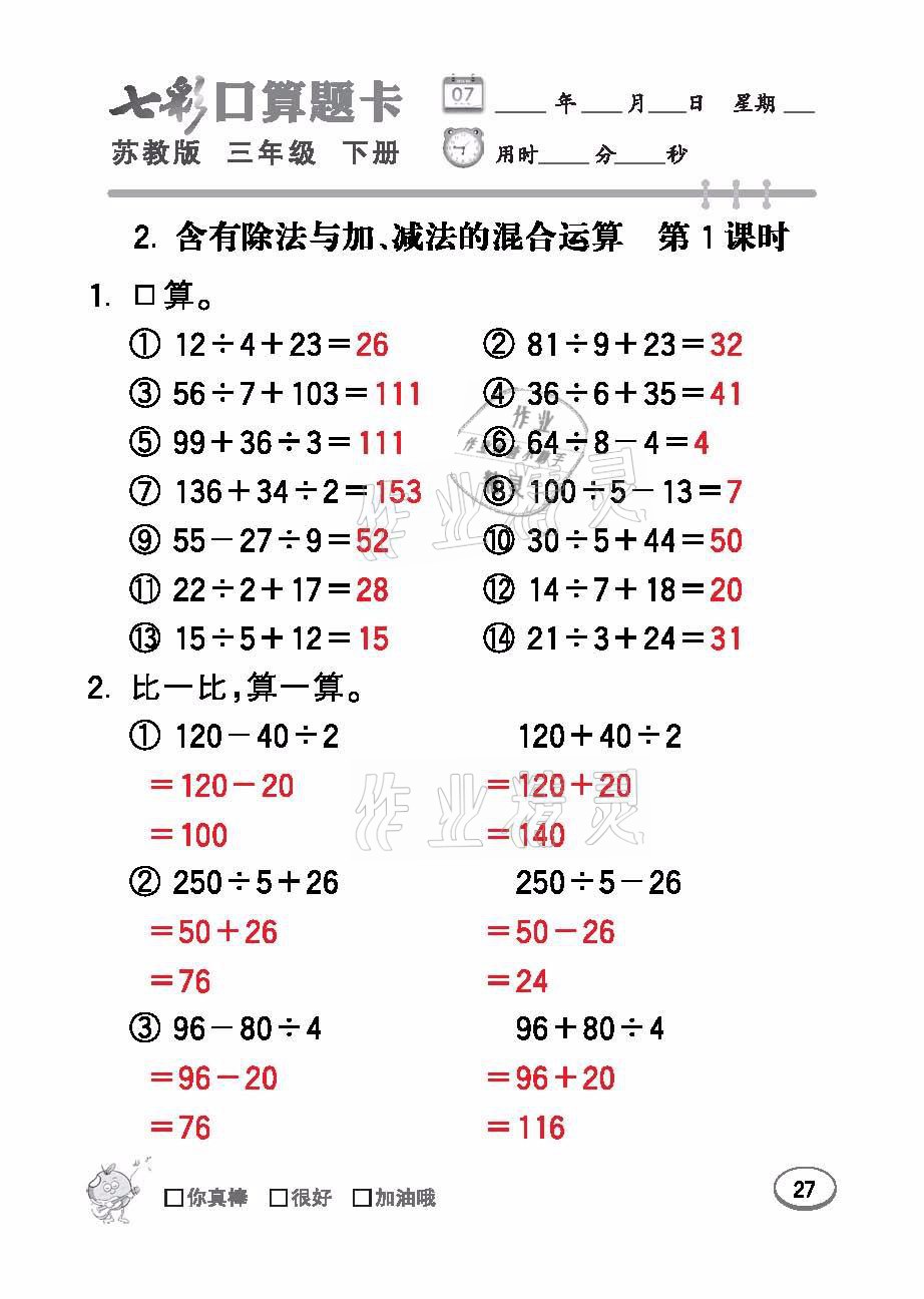 注:目前有些书本章节名称可能整理的还不是很完善,但都是按照顺序排列的,请同学们按照顺序仔细查找。练习册 2021年七彩口算题卡三年级数学下册苏教版 答案主要是用来给同学们做完题方便对答案用的,请勿直接抄袭。