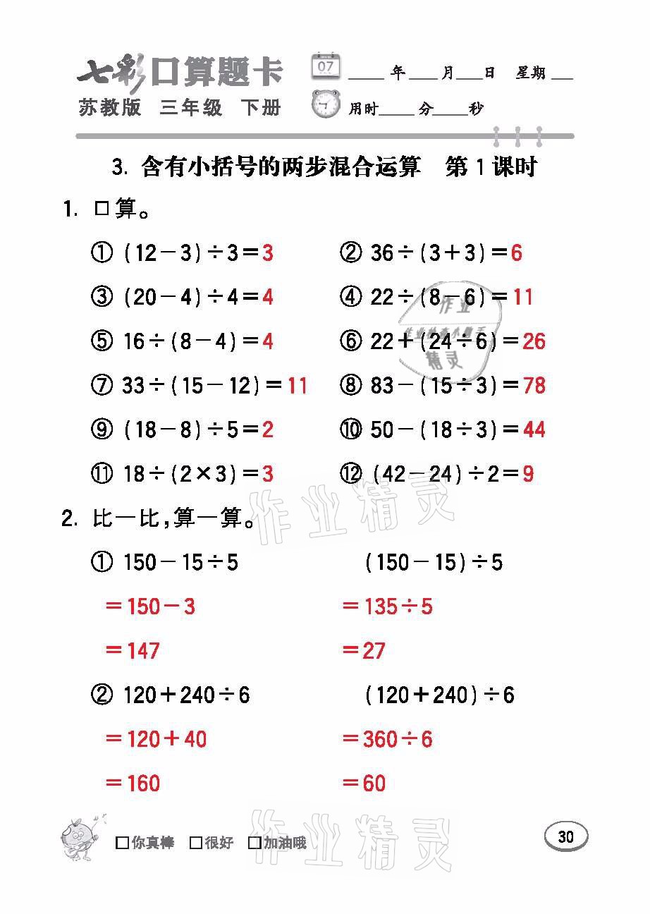 注:目前有些书本章节名称可能整理的还不是很完善,但都是按照顺序排列的,请同学们按照顺序仔细查找。练习册 2021年七彩口算题卡三年级数学下册苏教版 答案主要是用来给同学们做完题方便对答案用的,请勿直接抄袭。