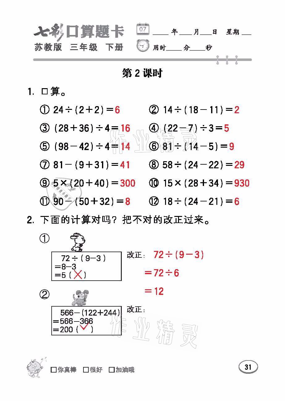 注:目前有些书本章节名称可能整理的还不是很完善,但都是按照顺序排列的,请同学们按照顺序仔细查找。练习册 2021年七彩口算题卡三年级数学下册苏教版 答案主要是用来给同学们做完题方便对答案用的,请勿直接抄袭。