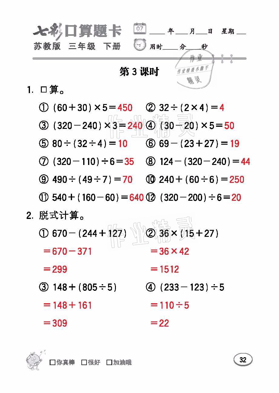 注:目前有些书本章节名称可能整理的还不是很完善,但都是按照顺序排列的,请同学们按照顺序仔细查找。练习册 2021年七彩口算题卡三年级数学下册苏教版 答案主要是用来给同学们做完题方便对答案用的,请勿直接抄袭。