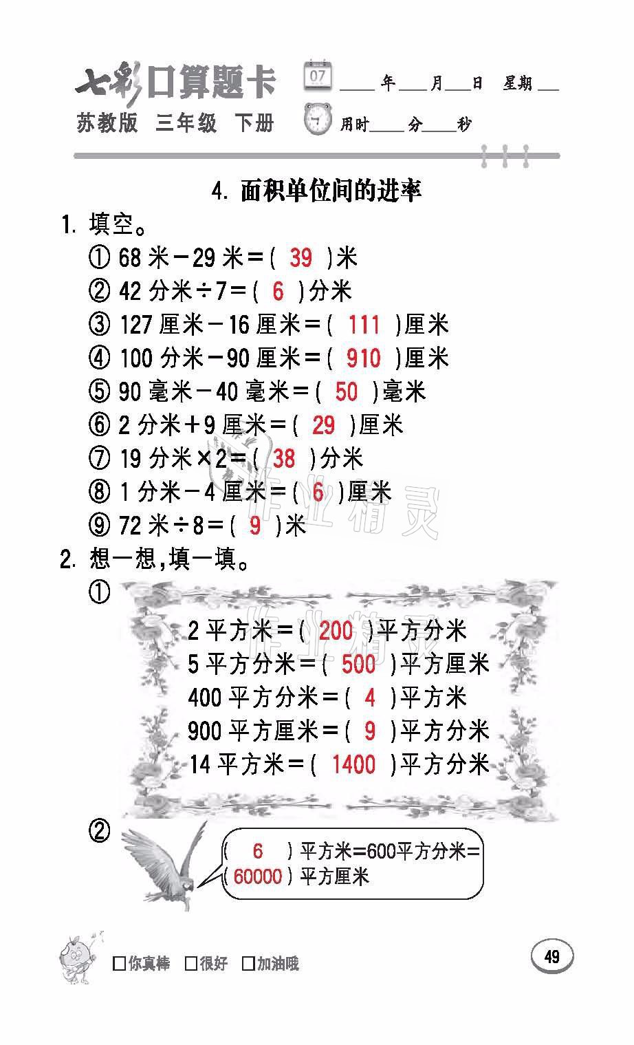 注:目前有些书本章节名称可能整理的还不是很完善,但都是按照顺序排列的,请同学们按照顺序仔细查找。练习册 2021年七彩口算题卡三年级数学下册苏教版 答案主要是用来给同学们做完题方便对答案用的,请勿直接抄袭。