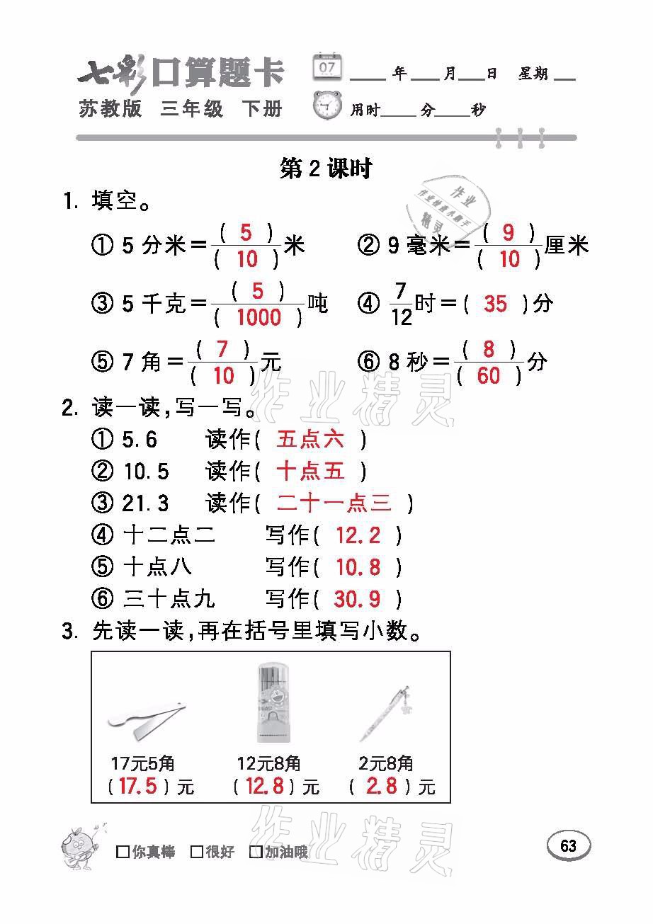 注:目前有些书本章节名称可能整理的还不是很完善,但都是按照顺序排列的,请同学们按照顺序仔细查找。练习册 2021年七彩口算题卡三年级数学下册苏教版 答案主要是用来给同学们做完题方便对答案用的,请勿直接抄袭。