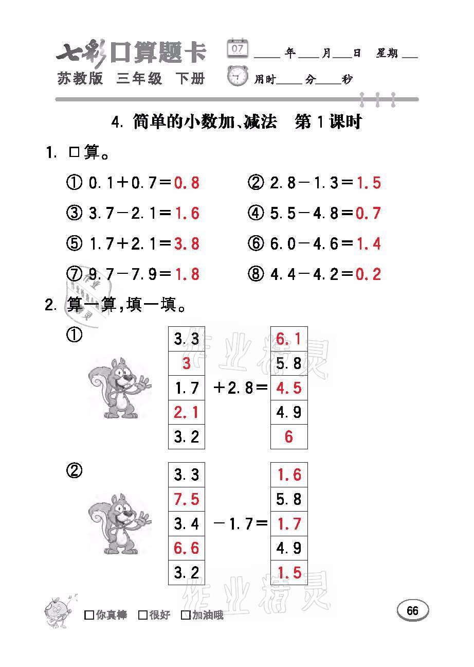 注:目前有些书本章节名称可能整理的还不是很完善,但都是按照顺序排列的,请同学们按照顺序仔细查找。练习册 2021年七彩口算题卡三年级数学下册苏教版 答案主要是用来给同学们做完题方便对答案用的,请勿直接抄袭。