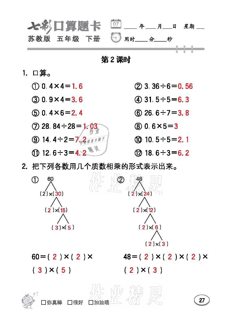 注:目前有些书本章节名称可能整理的还不是很完善,但都是按照顺序排列的,请同学们按照顺序仔细查找。练习册 2021年七彩口算题卡五年级数学下册苏教版 答案主要是用来给同学们做完题方便对答案用的,请勿直接抄袭。