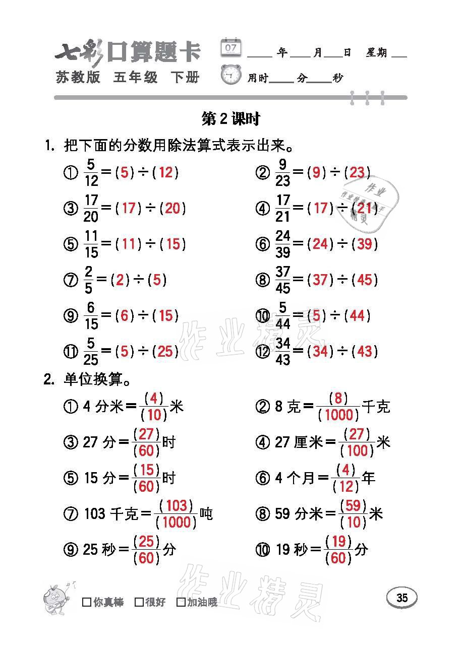 注:目前有些书本章节名称可能整理的还不是很完善,但都是按照顺序排列的,请同学们按照顺序仔细查找。练习册 2021年七彩口算题卡五年级数学下册苏教版 答案主要是用来给同学们做完题方便对答案用的,请勿直接抄袭。
