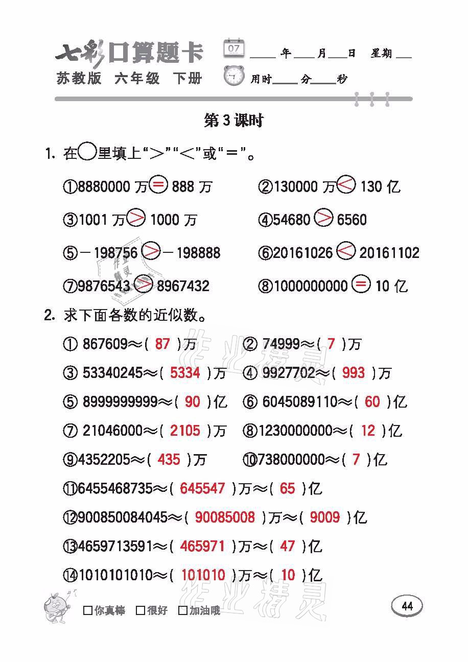 注:目前有些书本章节名称可能整理的还不是很完善,但都是按照顺序排列的,请同学们按照顺序仔细查找。练习册 2021年七彩口算题卡六年级数学下册苏教版 答案主要是用来给同学们做完题方便对答案用的,请勿直接抄袭。