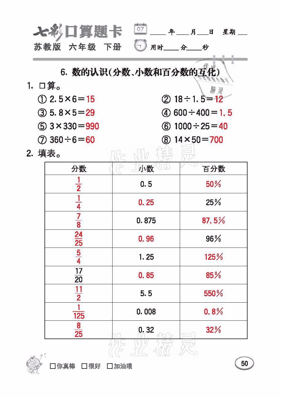注:目前有些书本章节名称可能整理的还不是很完善,但都是按照顺序排列的,请同学们按照顺序仔细查找。练习册 2021年七彩口算题卡六年级数学下册苏教版 答案主要是用来给同学们做完题方便对答案用的,请勿直接抄袭。