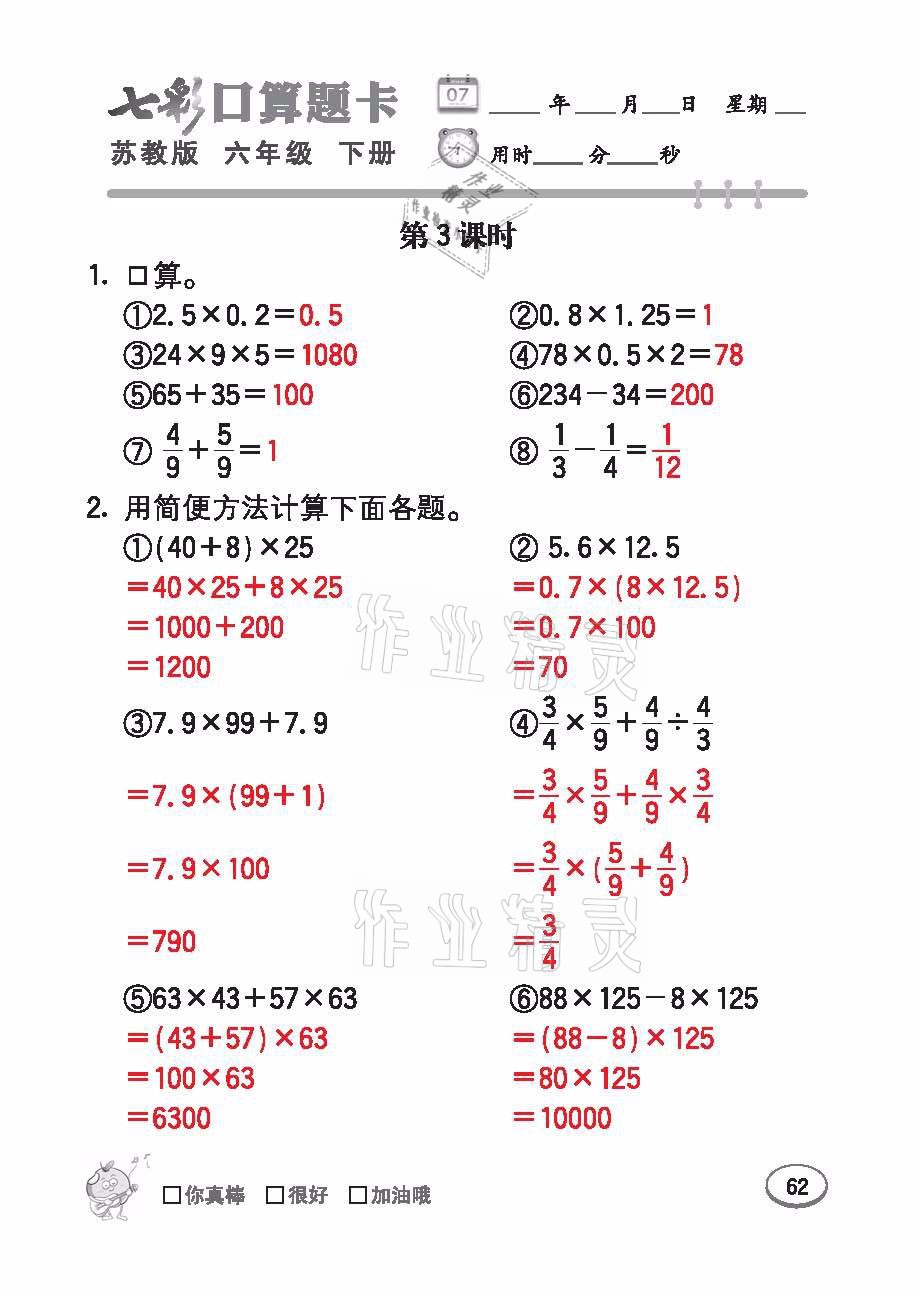 注:目前有些书本章节名称可能整理的还不是很完善,但都是按照顺序排列的,请同学们按照顺序仔细查找。练习册 2021年七彩口算题卡六年级数学下册苏教版 答案主要是用来给同学们做完题方便对答案用的,请勿直接抄袭。