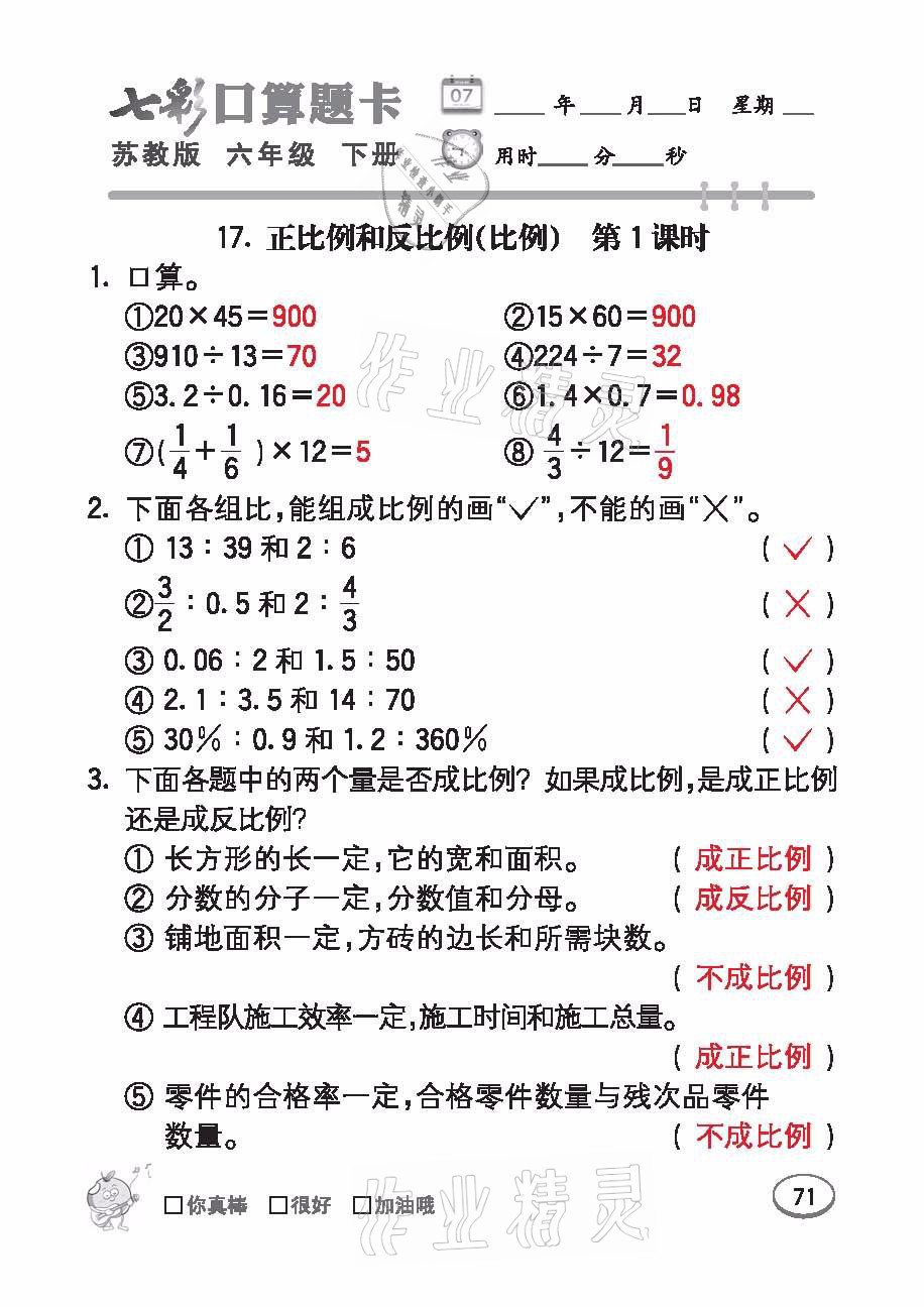 注:目前有些书本章节名称可能整理的还不是很完善,但都是按照顺序排列的,请同学们按照顺序仔细查找。练习册 2021年七彩口算题卡六年级数学下册苏教版 答案主要是用来给同学们做完题方便对答案用的,请勿直接抄袭。
